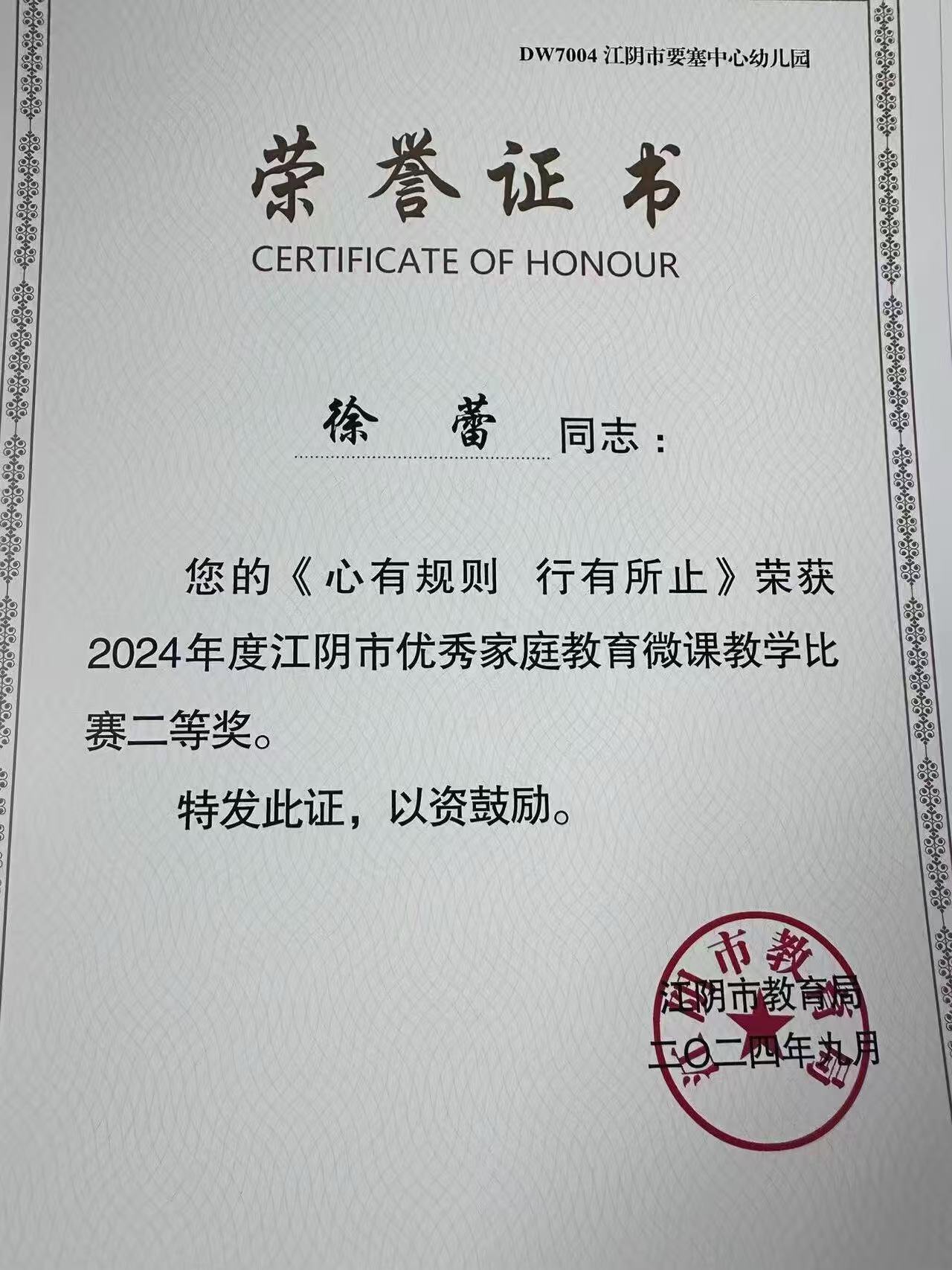 徐蕾老师的《心有规则 行有所止》获江阴市优秀家庭教育微课比赛二等奖 2025-08-19