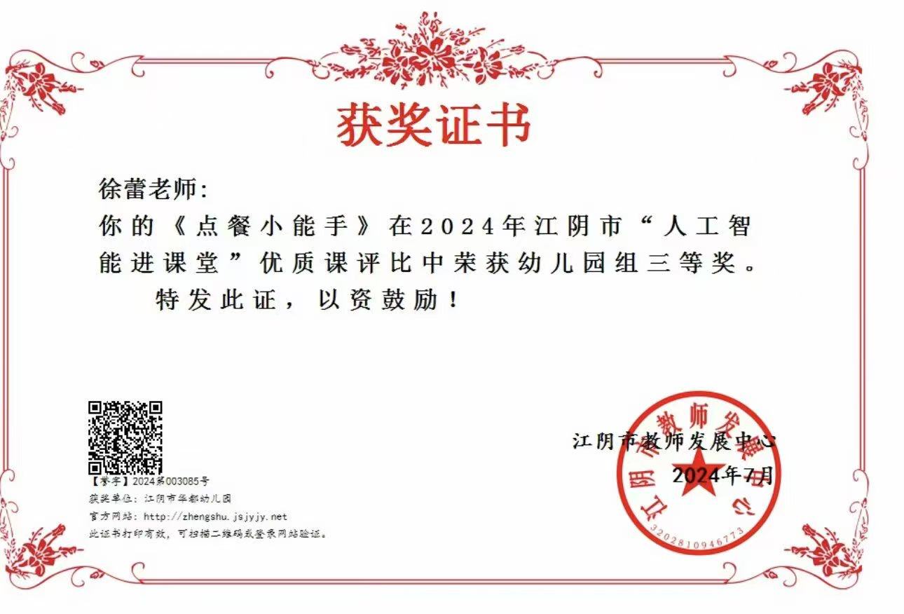 徐蕾老师的《点餐小能手》在江阴市人工智能进课堂优质课评比中获三等奖