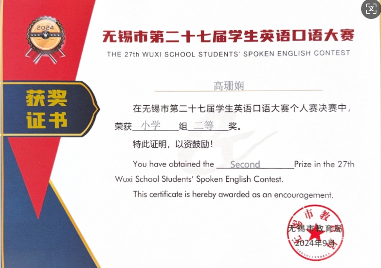 李君老师辅导学生高珊娴获得无锡口语大赛二等奖~~
