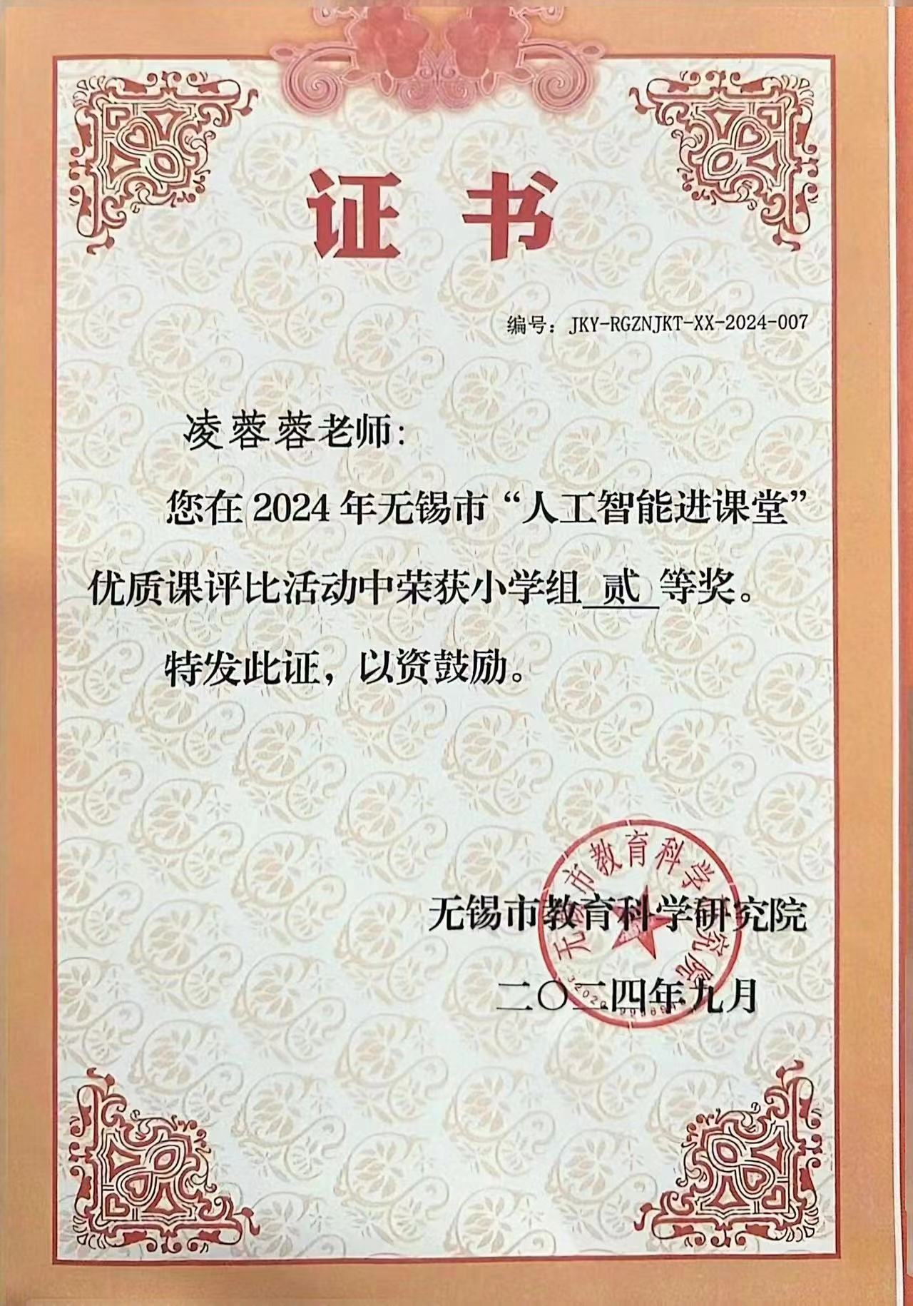凌蓉蓉老师在无锡市“人工智能进课堂”优质课评比活动中荣获二等奖~~