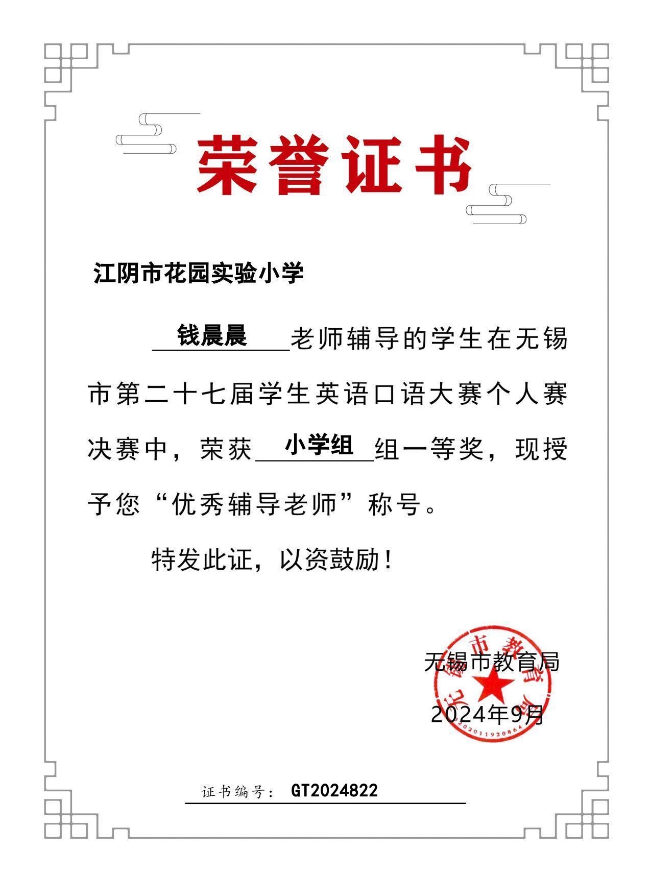 钱晨晨老师在无锡口语大赛中获“优秀辅导老师”称号~~