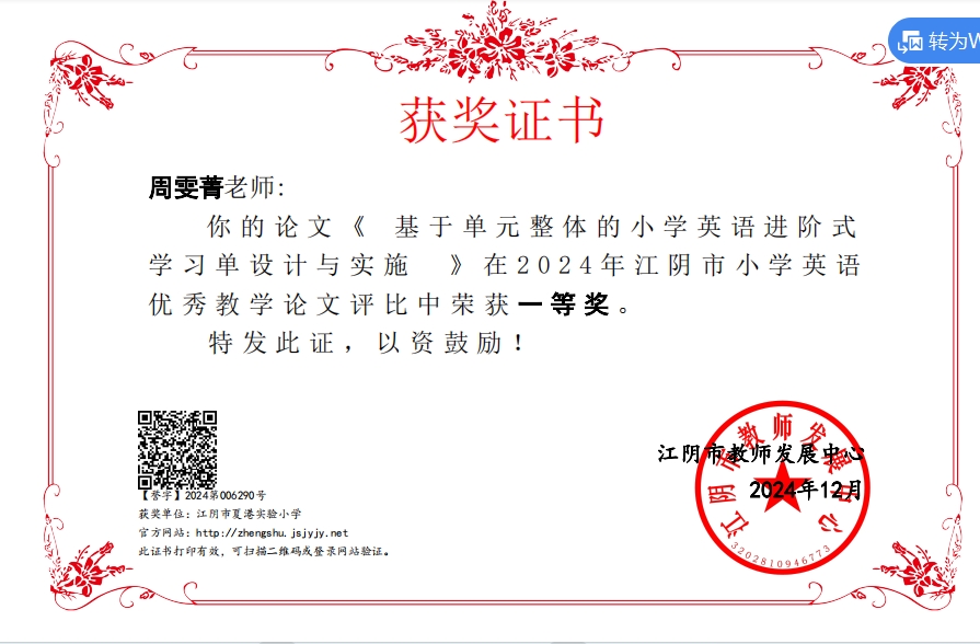 周雯菁老师论文获无锡市一等奖~~