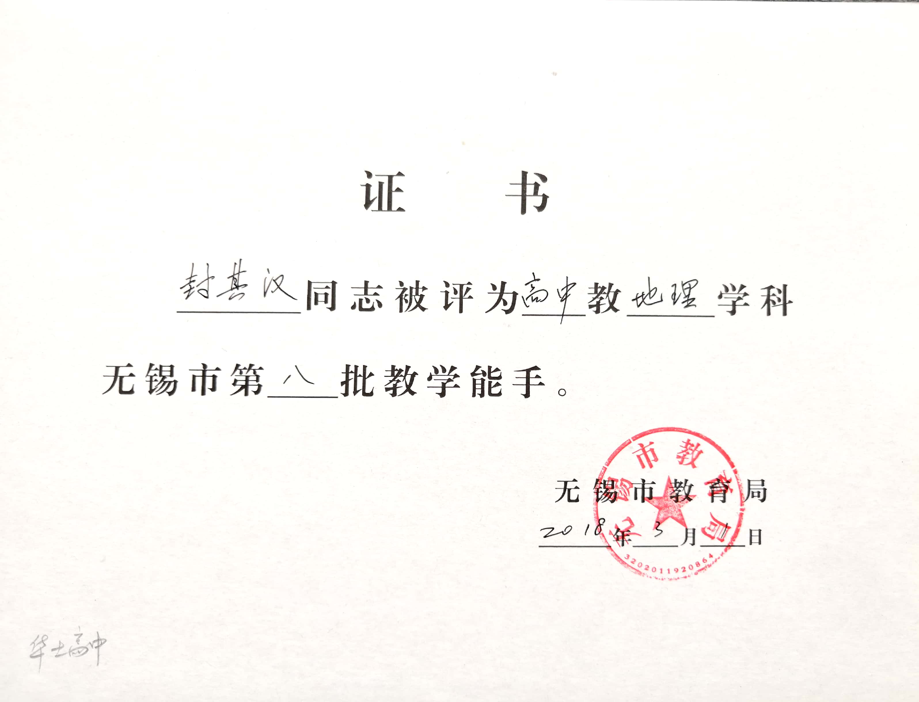 封其汉老师被评为无锡市第八批教学能手