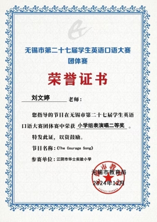 刘文婷老师辅导学生获无锡口语大赛团体二等奖~~