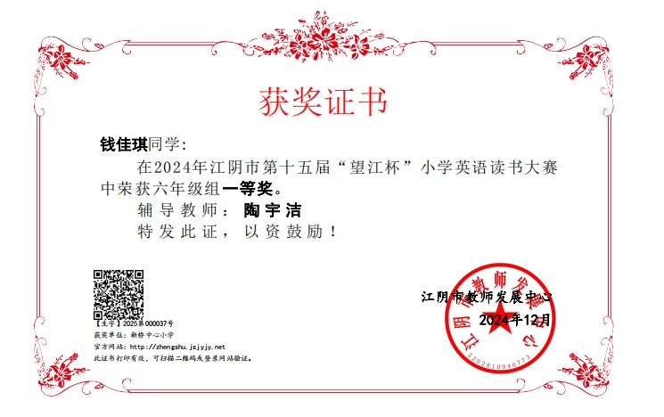 陶宇洁老师辅导学生钱佳琪获江阴市“望江杯”读书大赛一等奖~~