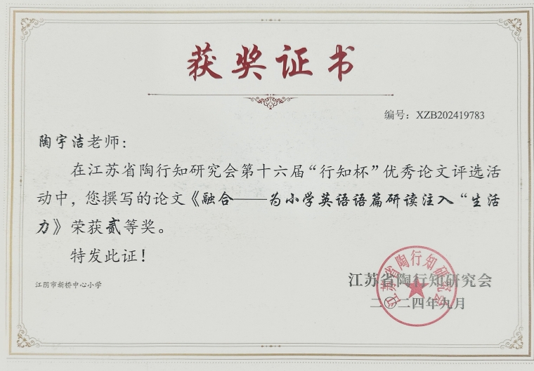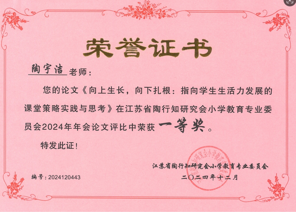 陶宇洁老师论文获江苏省一等奖~~