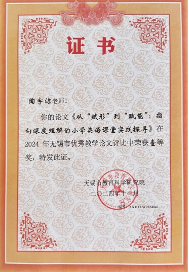 陶宇洁老师论文获无锡市一等奖