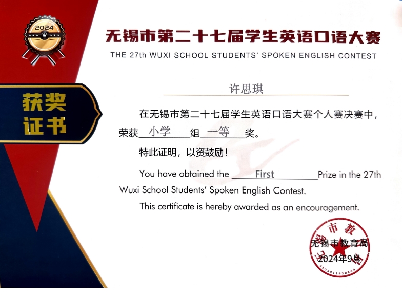 谢沁辰老师辅导学生许思琪获无锡口语大赛一等奖~~