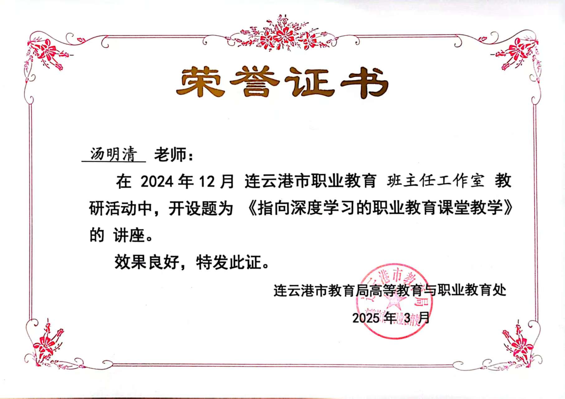 汤明清老师为连云港职业教育班主任工作室教研活动作《指向深度学习的职业教育课堂教学》专题讲座 2025-08-29