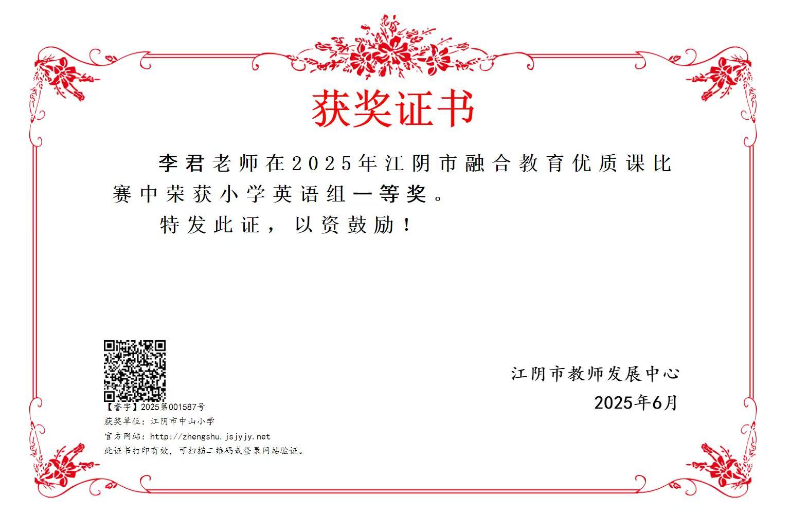 李君老师获江阴市融合教育优质课一等奖