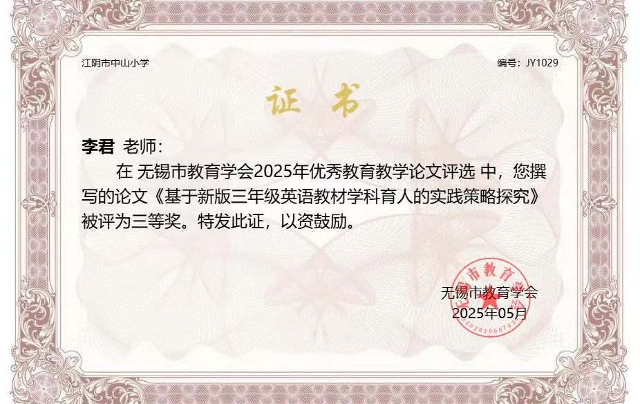 李君老师论文获得无锡三等奖