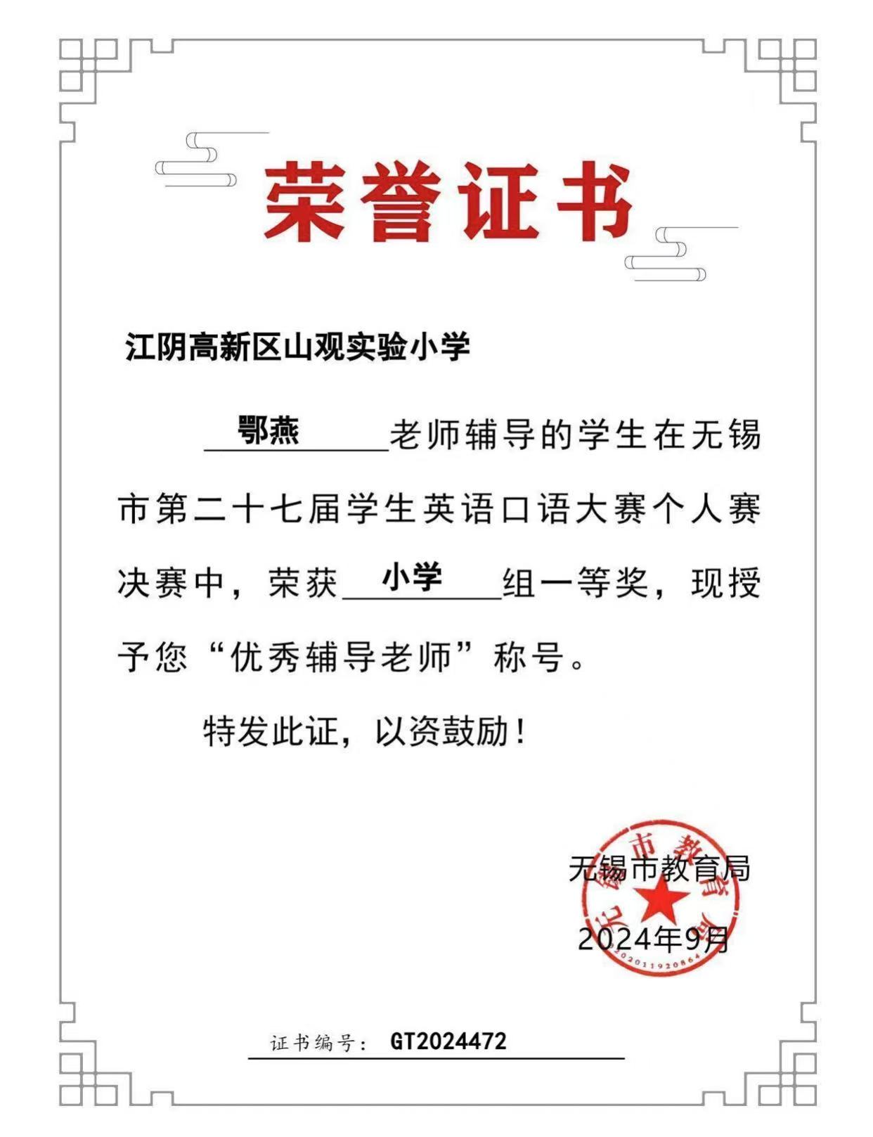 鄂燕老师在无锡口语大赛中获得“优秀辅导老师”~~