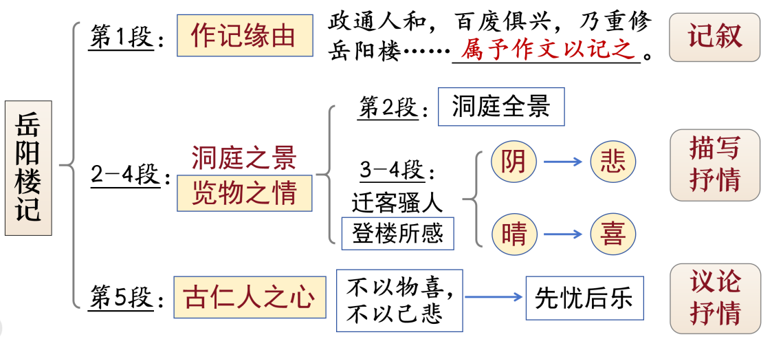 本文虽名为“记”,但不以记叙重修岳阳楼之事为主,而是以描写洞庭湖的景象为主,描写景象是为了引出“览物之情”。