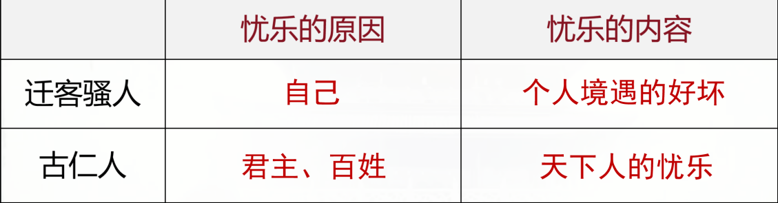3.比较“迁客骚人”和“古仁人”的忧乐观,完成下表。