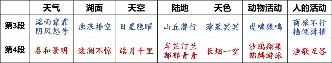 这一段写春日天晴时的洞庭湖,渲染了明媚艳丽、生机盎然的意境。