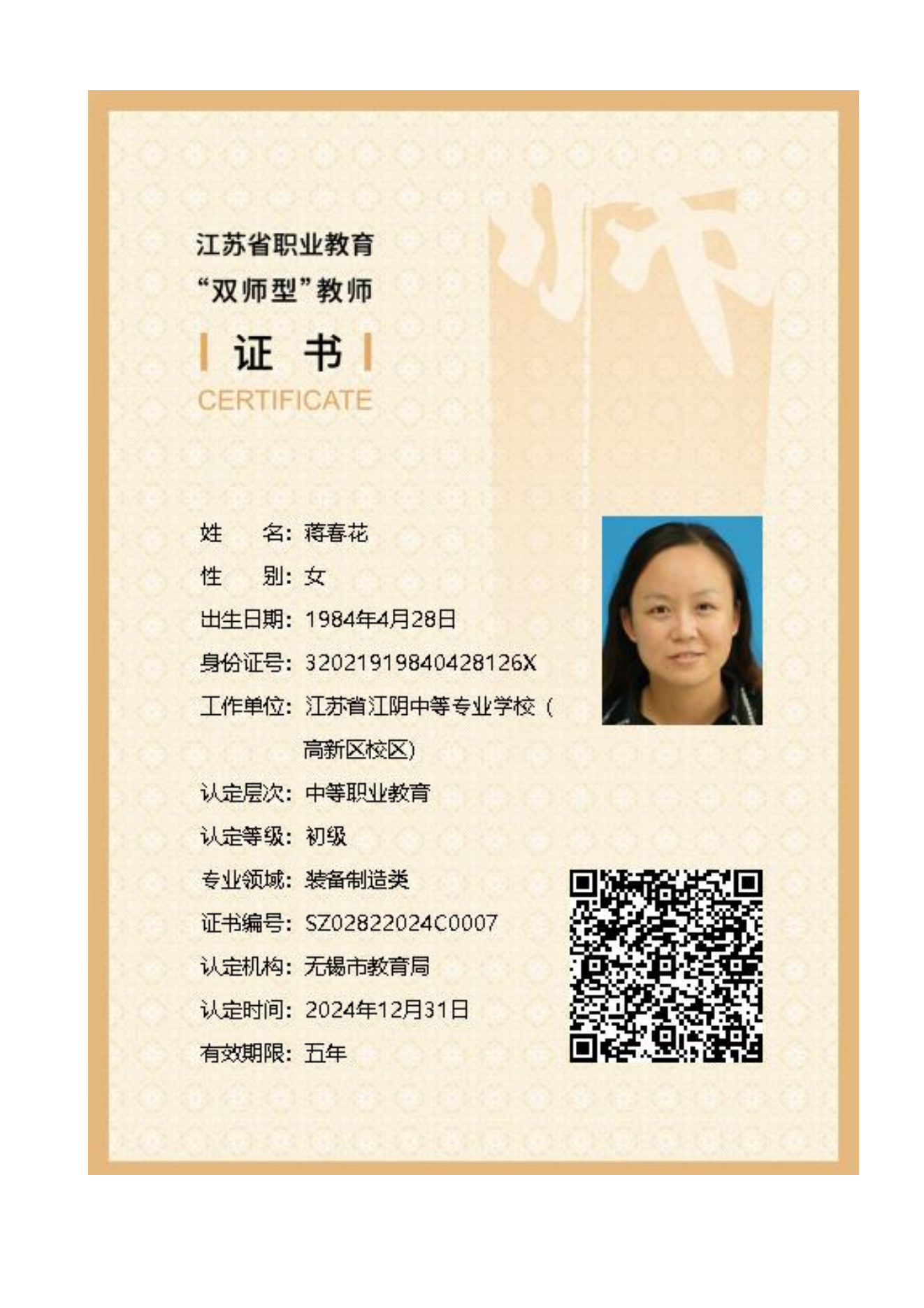 蒋春花:“双师型”教师证书