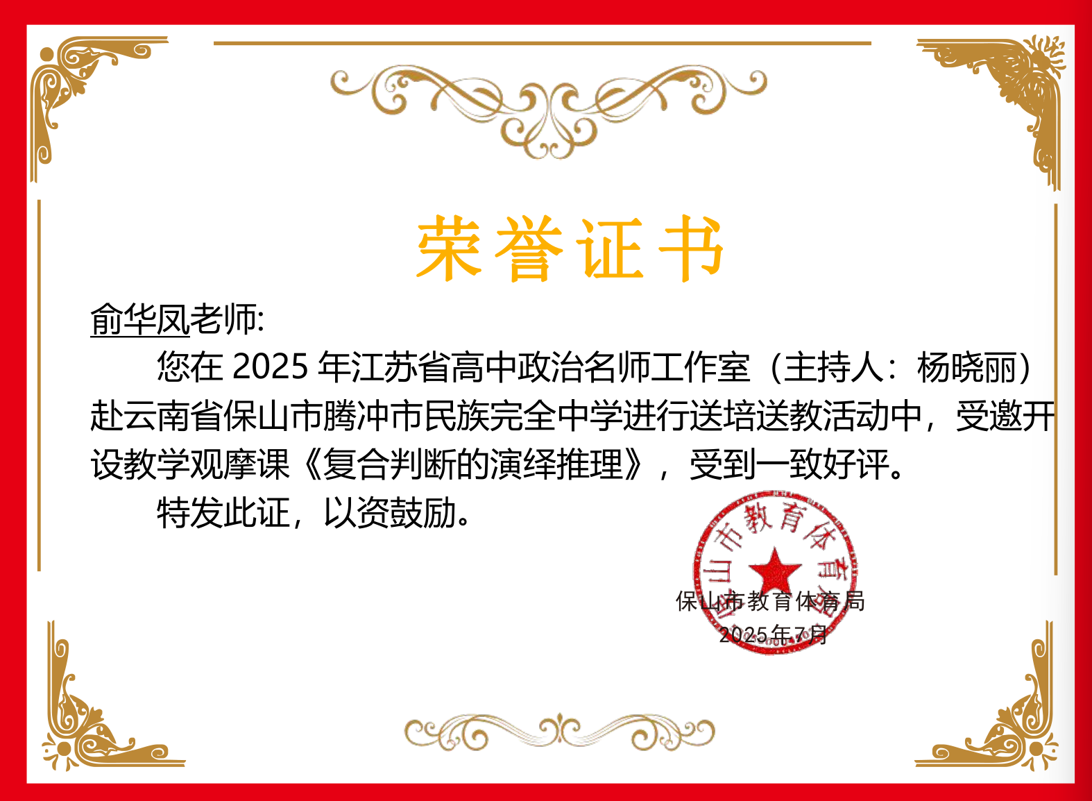 网站类目:教学设计 活动级别:市级 活动类别: 执教姓名:俞华凤 所在单位:江苏省江阴市第一中学 执教时间:2025-08-23 执教地点:云南省保山市腾冲市民族完全中学 执教内容:复合判断的演绎推理 参加对象:保山市高三思政骨干教师