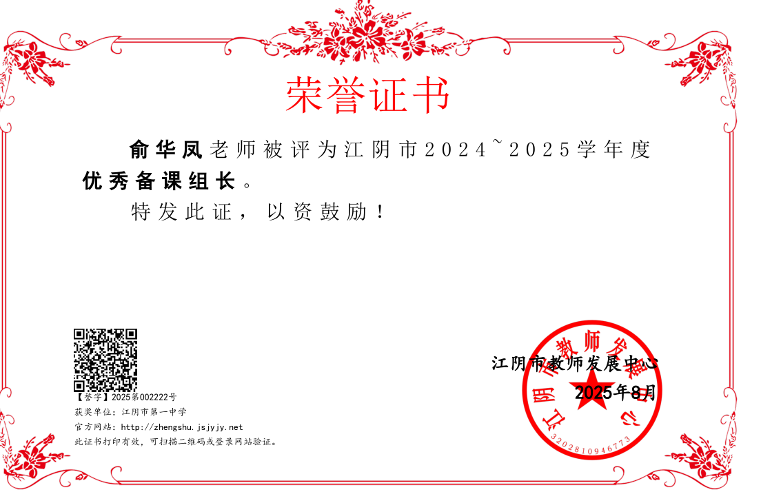 网站类目:荣誉提升情况 姓名:俞华凤 所在单位:江苏省江阴市第一中学 荣誉类别:名师 荣誉级别:县级 获得时间:2025-09-04 评比部门:江阴市优秀备课组长