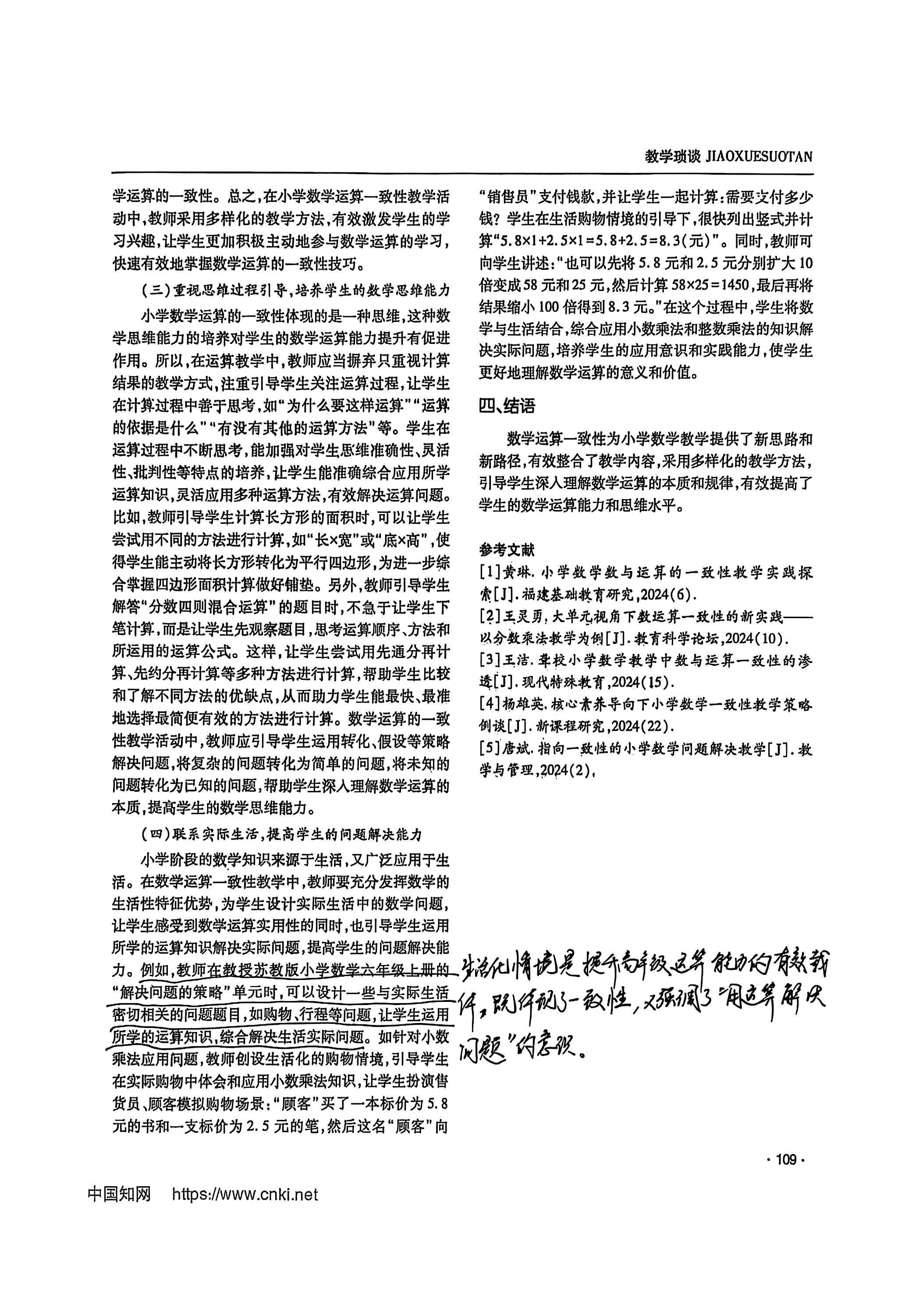 在问题剖析环节,文章精准指出教师认知不足、运算体系缺失、教学方法单一三大核心问题,切中一线教学中 “碎片化教学”“重结果轻过程” 的普遍症结。而教学改进策略部分,更是立足实操,提出整合教学内容、创新教学方法、引导思维过程、联系生活实际四大路径,且每个策略均搭配苏教版教材中的具体案例(如分数乘除法、小数乘法教学),让理论落地有章可循,为教师搭建了从 “理解一致性” 到 “实践一致性教学” 的清晰桥梁。