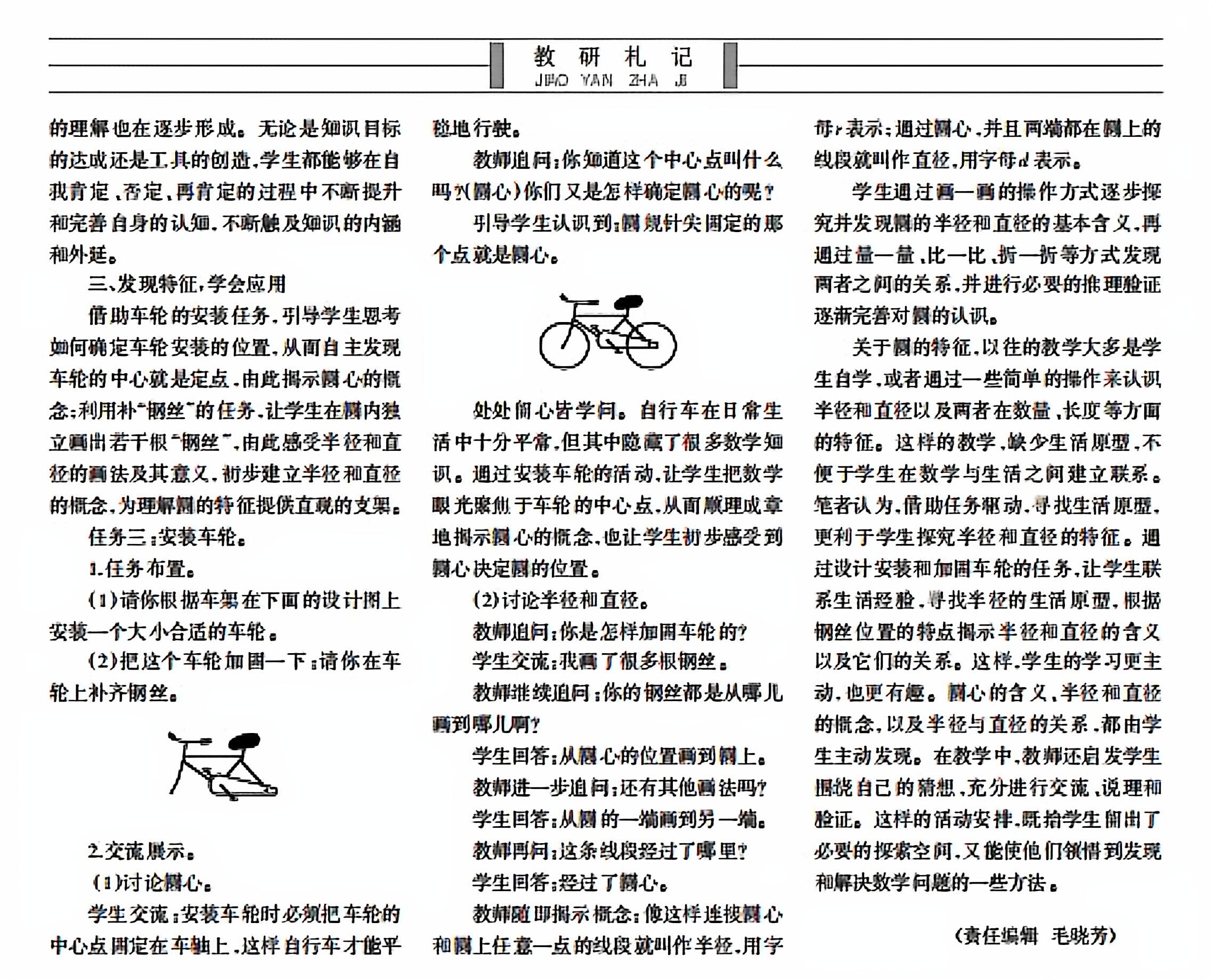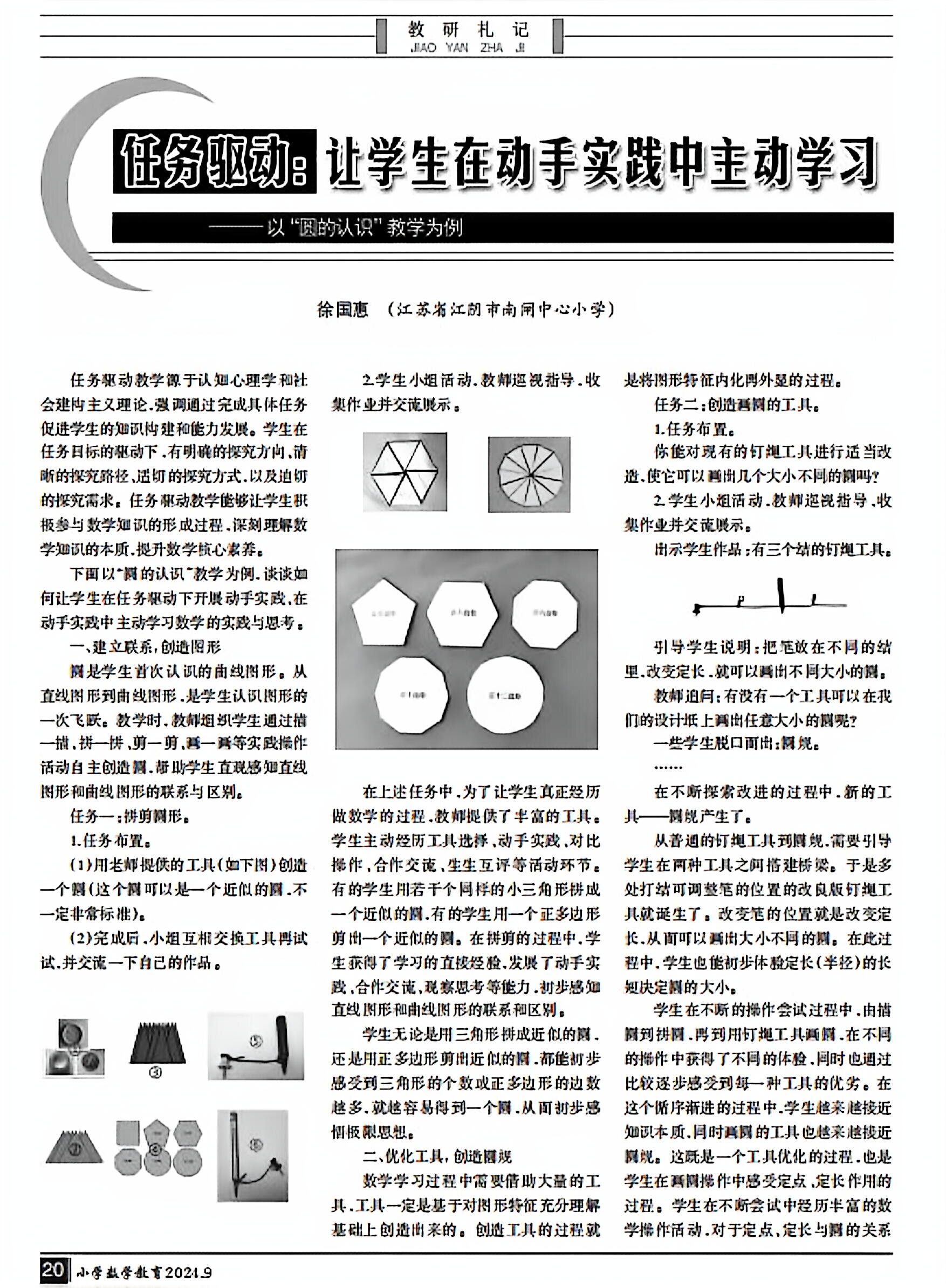 该论文《任务驱动:让学生在动手实践中主动学习——以“圆的认识”教学为例》以“圆的认识”为教学载体,系统阐述了如何通过任务驱动教学法引导学生从实际操作中构建数学概念,实现从直线图形到曲线图形的认知跨越。作者徐国惠老师基于认知心理学与社会建构主义理论,设计了“拼剪图形—创造工具—发现特征”三个层次的任务链,逐步引导学生通过拼图、改良工具、安装车轮等真实活动,主动探索圆的本质特征(圆心、半径、直径等),并在过程中渗透极限思想、工具创新意识与数学应用能力。