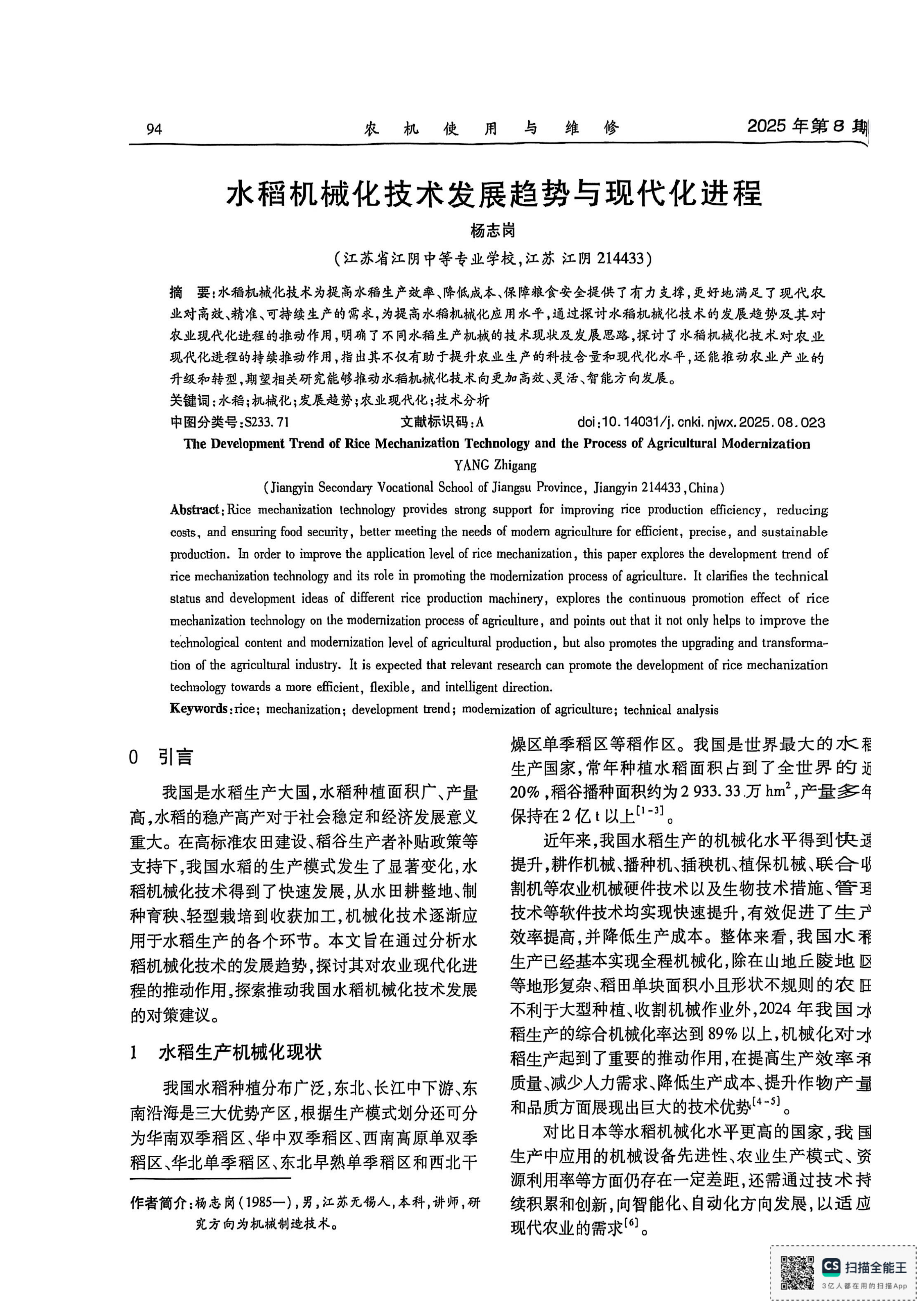 杨志刚:论文《水稻机械化技术发展趋势与现代化进程》发表于《农机使用与维修》