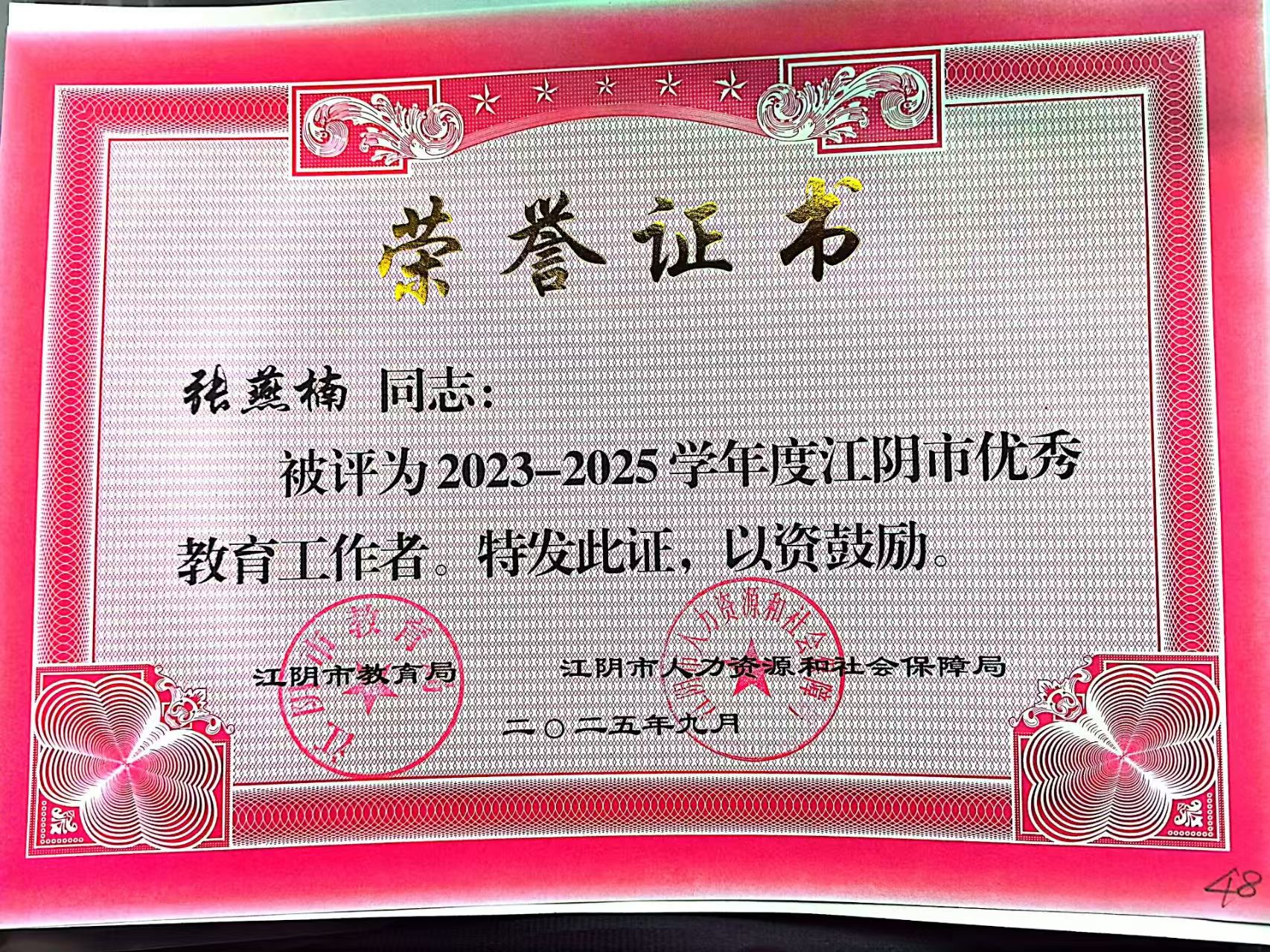 张燕楠被评为2023-2025学年度江阴市优秀教育工作者 2025-09-14