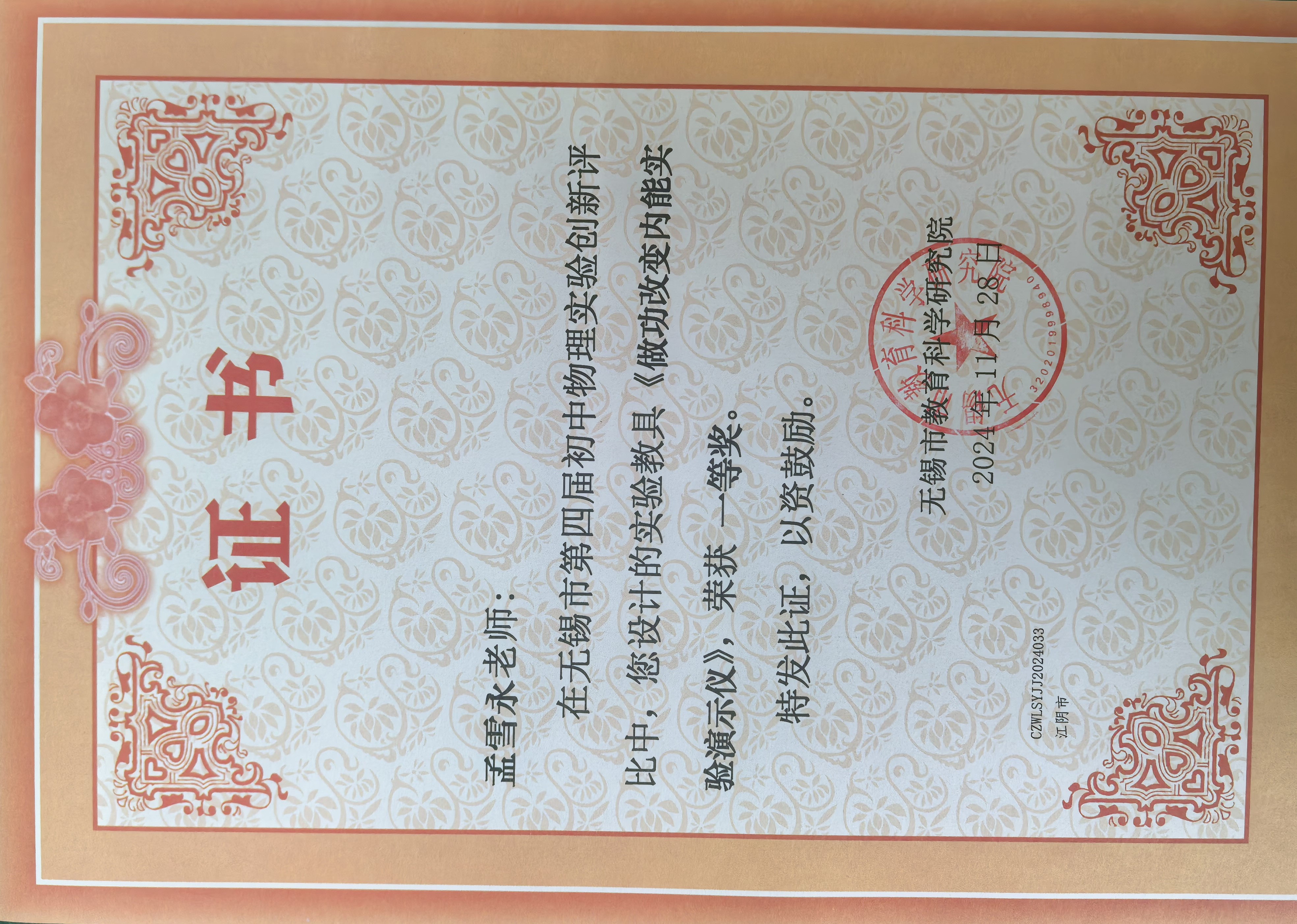 孟雪永参加无锡市初中物理实验创新评比获一等奖