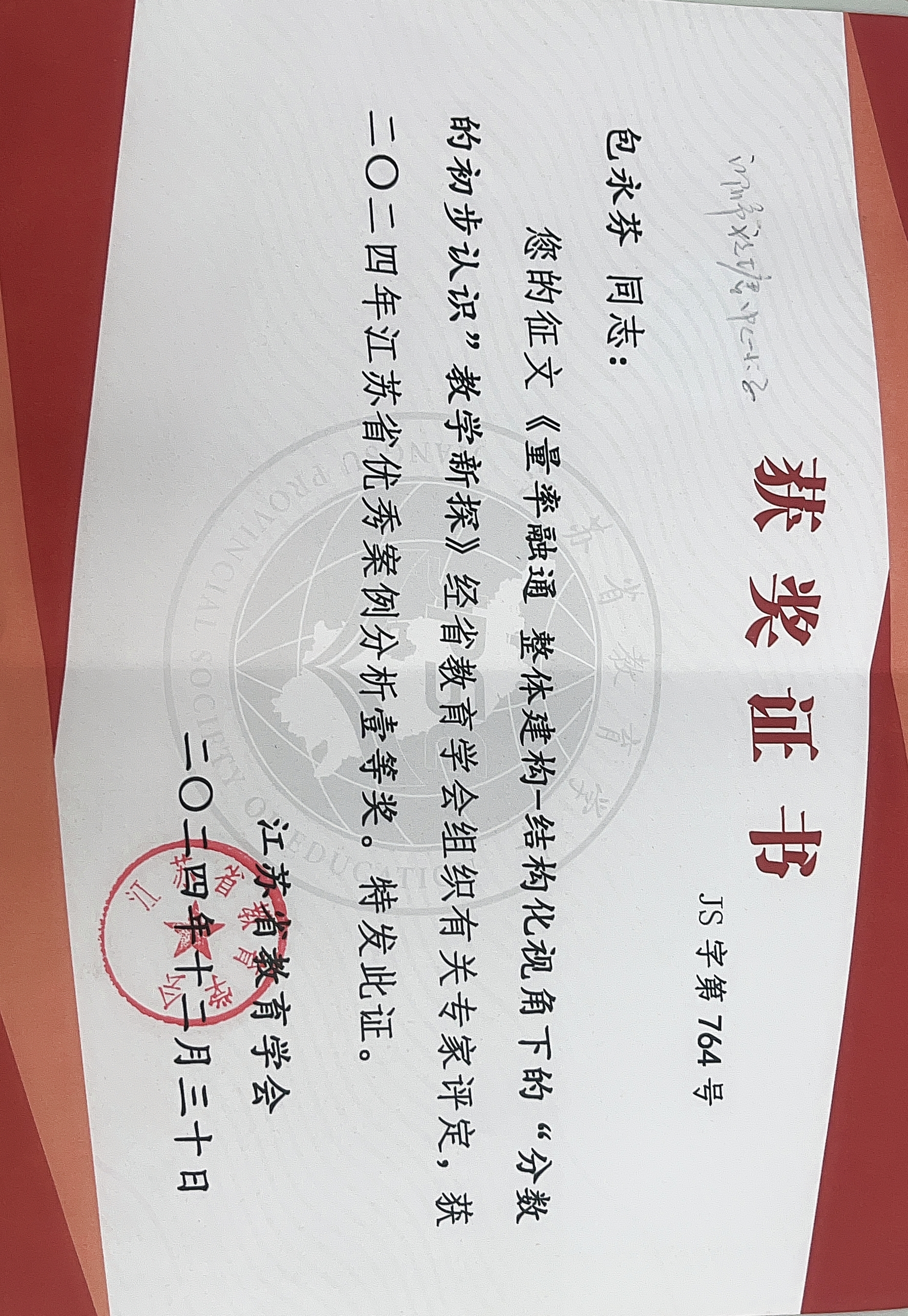 包永芬 论文《量率融通 整体建构——结构化视角下的“分数的初步认识”新探》江苏省一等奖 2025-09-16