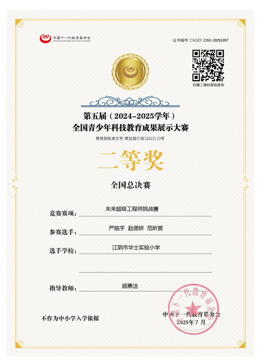 顾惠洁+严皓宇 赵偲妍 范昕宸+全国青少年科技教育成果展示大赛二等奖