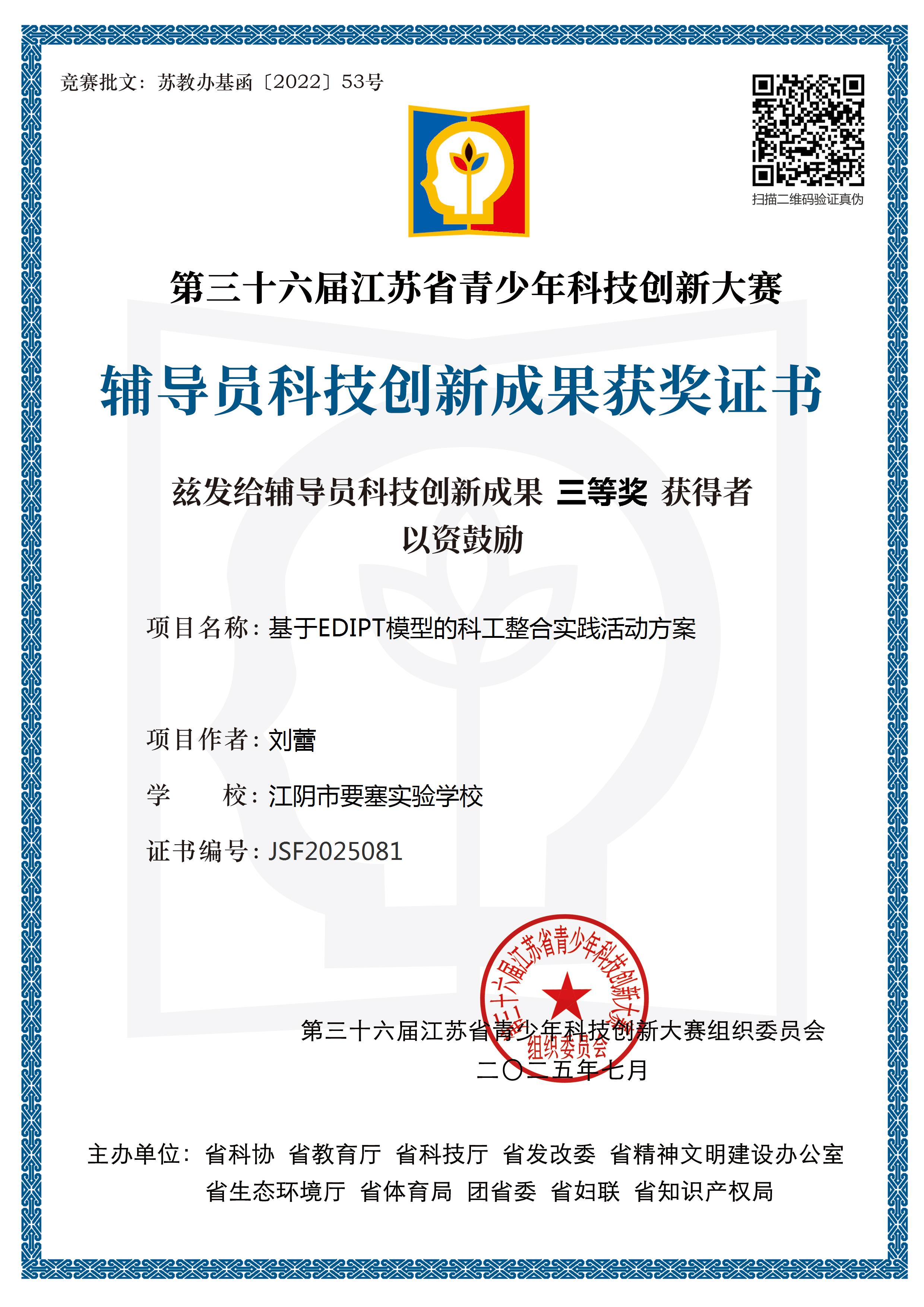 江苏省青少年科技创新大赛(科教方案)刘蕾 三等奖