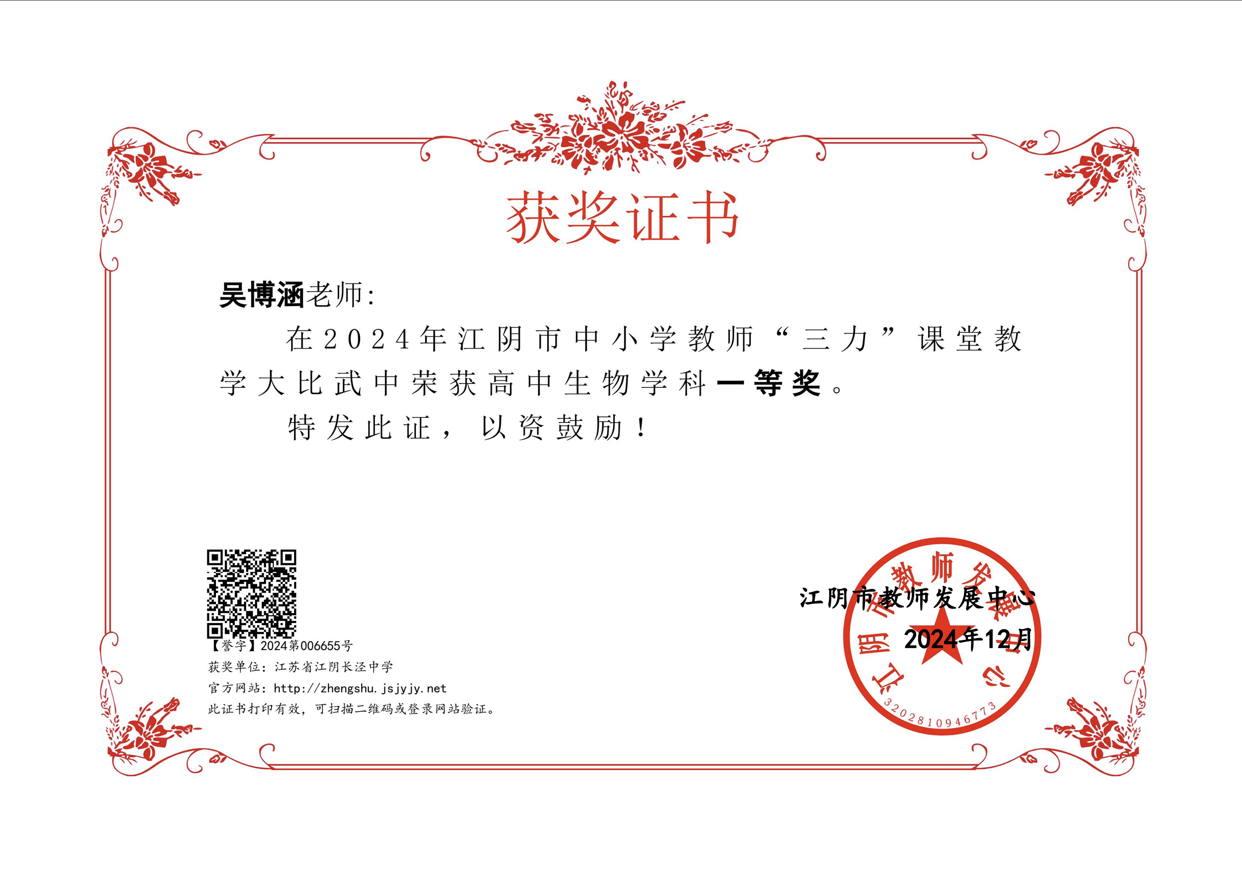 网站类目:学科比赛情况 姓名:吴博涵 所在单位:江苏省南菁高级中学 获奖类别:中小学教师课堂教学大比武 获奖级别:县级 获奖等级: 获奖时间:2024-12-10 评比部门:江阴市教师发展中心 发表刊物: 刊物级别:县级 发表时间:2024-09-16