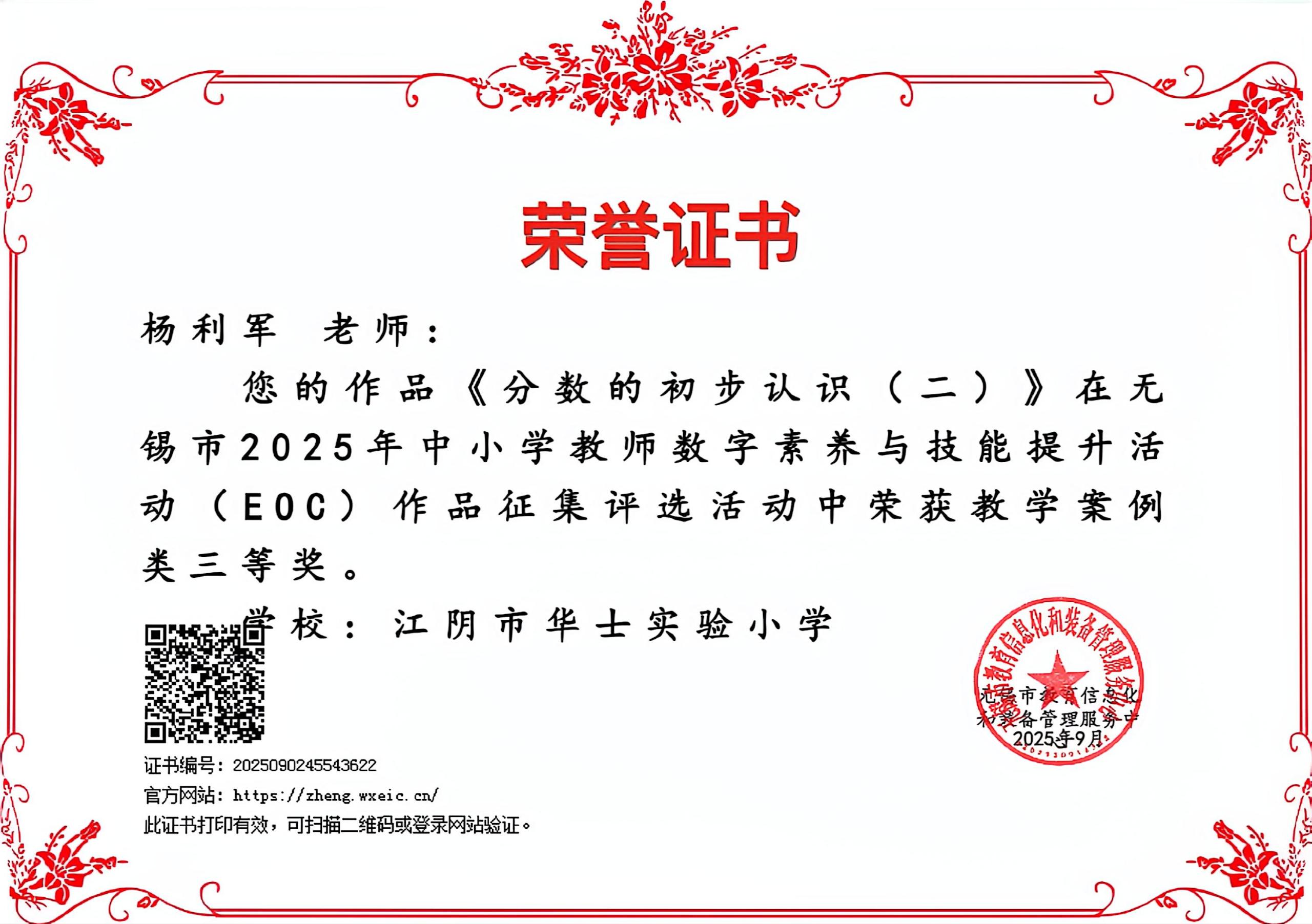 网站类目:学科比赛情况 姓名:杨利军 所在单位:江阴市华士实验小学 获奖类别: 获奖级别:市级 获奖等级: 获奖时间:2025-09-01 评比部门:无锡市信息装备管理服务中心 发表刊物: 刊物级别:国家级 发表时间:2025-09-01