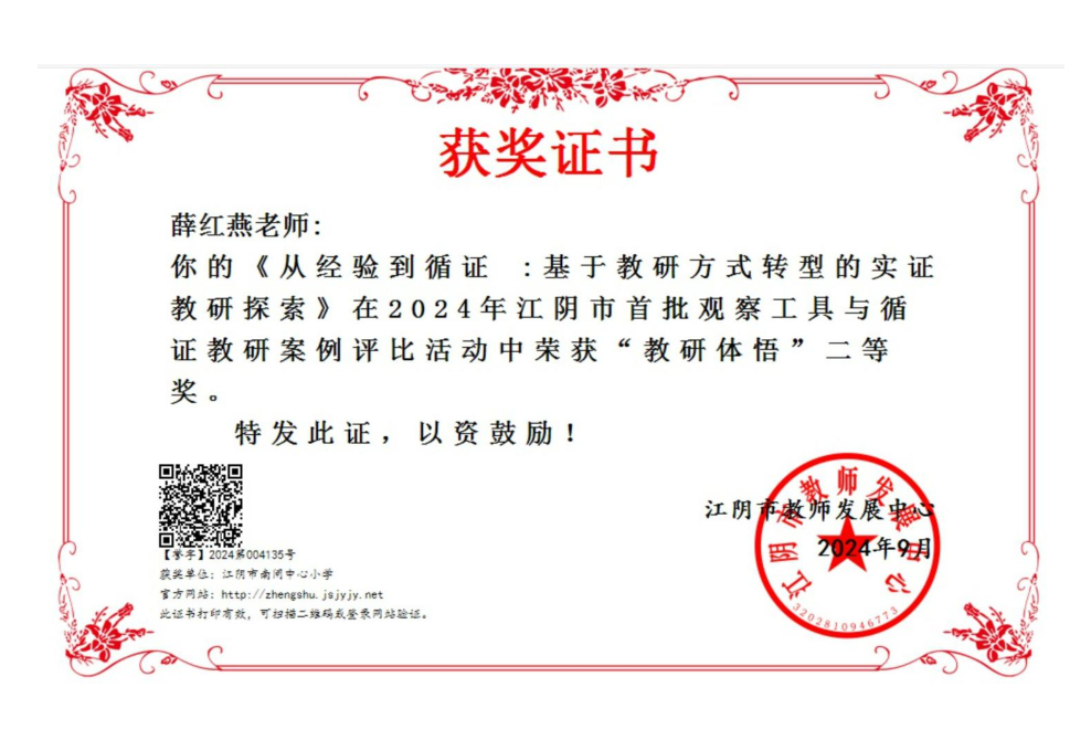 网站类目:学科比赛情况 姓名:薛红燕 所在单位:江阴市南闸中心小学 获奖类别:循证案例评比 获奖级别:县级 获奖等级: 获奖时间:2025-09-16 评比部门:江阴市教师发展中心 发表刊物: 刊物级别:县级 发表时间:2025-09-16