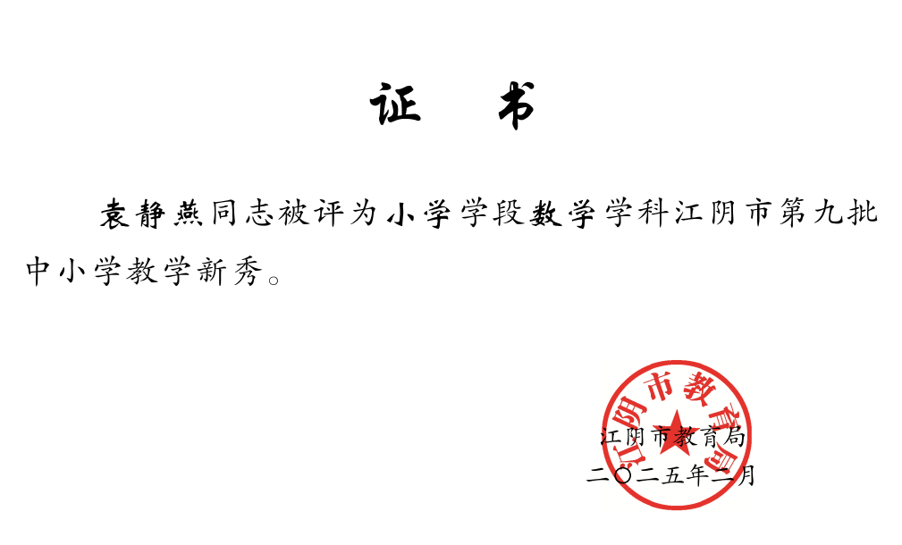 网站类目:荣誉提升情况 姓名:袁静燕 所在单位:江阴市祝塘中心小学 荣誉类别:新秀 荣誉级别:市级 获得时间:2025-02-28 评比部门: