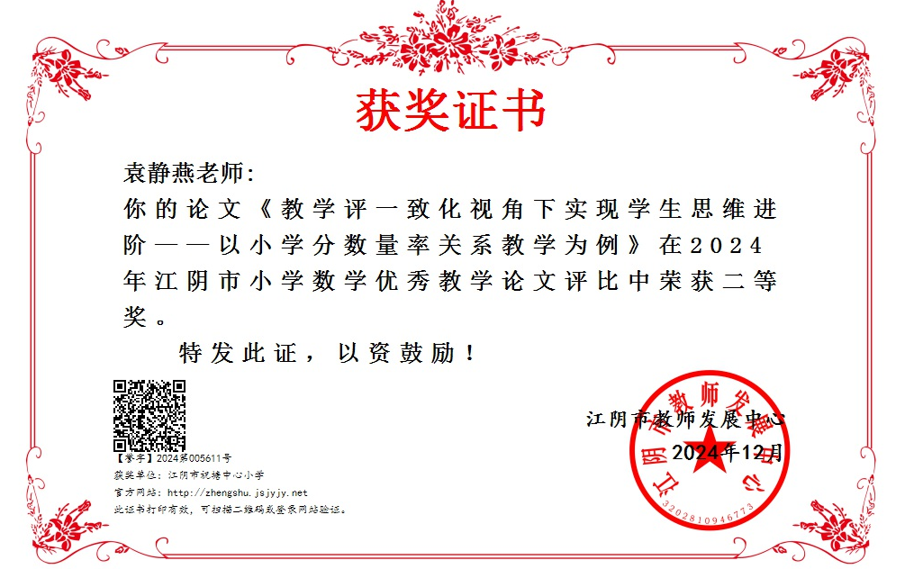 袁静燕 论文《教学评一致化视角下实现学生思维进阶——以小学分数量率关系教学为例》二等奖