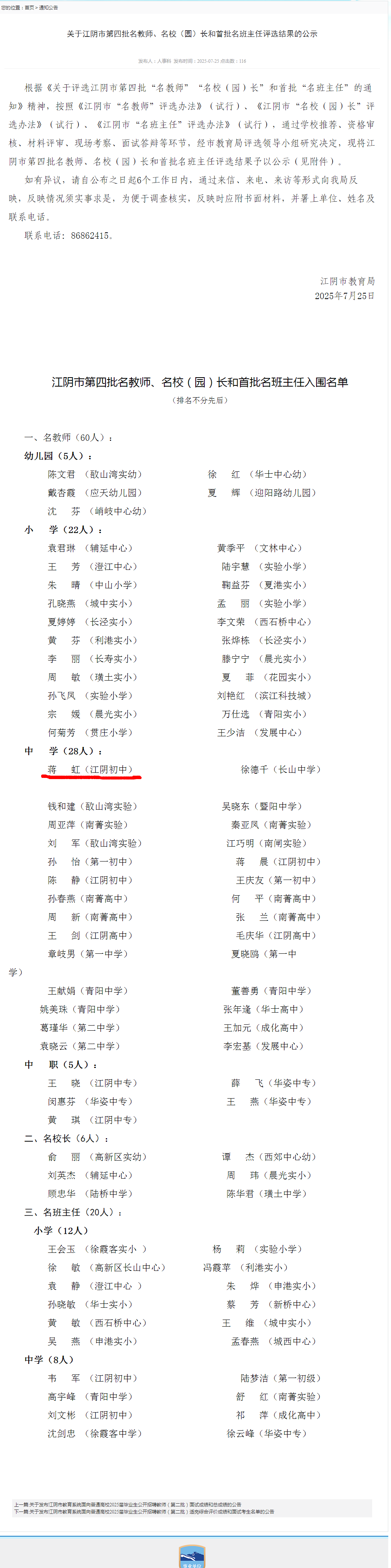 网站类目:荣誉提升情况 姓名:蒋虹 所在单位:江阴初级中学 荣誉类别:名师 荣誉级别:县级 获得时间:2025-08-08 评比部门:江阴市教育局