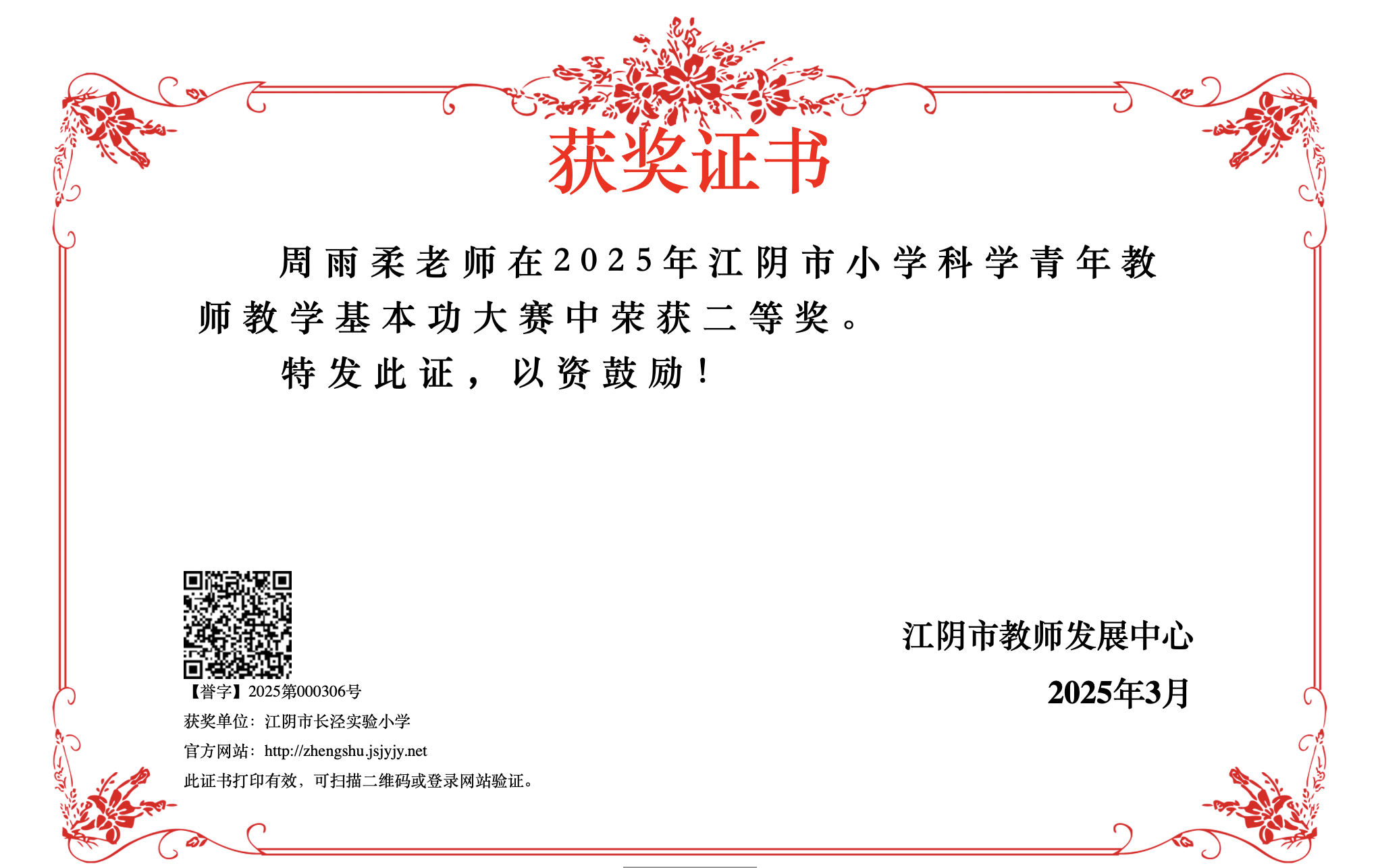 网站类目:学科比赛情况 姓名:周雨柔 所在单位:江阴市长泾实验小学 获奖类别: 获奖级别:县级 获奖等级: 获奖时间:2025-03-28 评比部门: 发表刊物: 刊物级别:县级 发表时间:2025-03-28