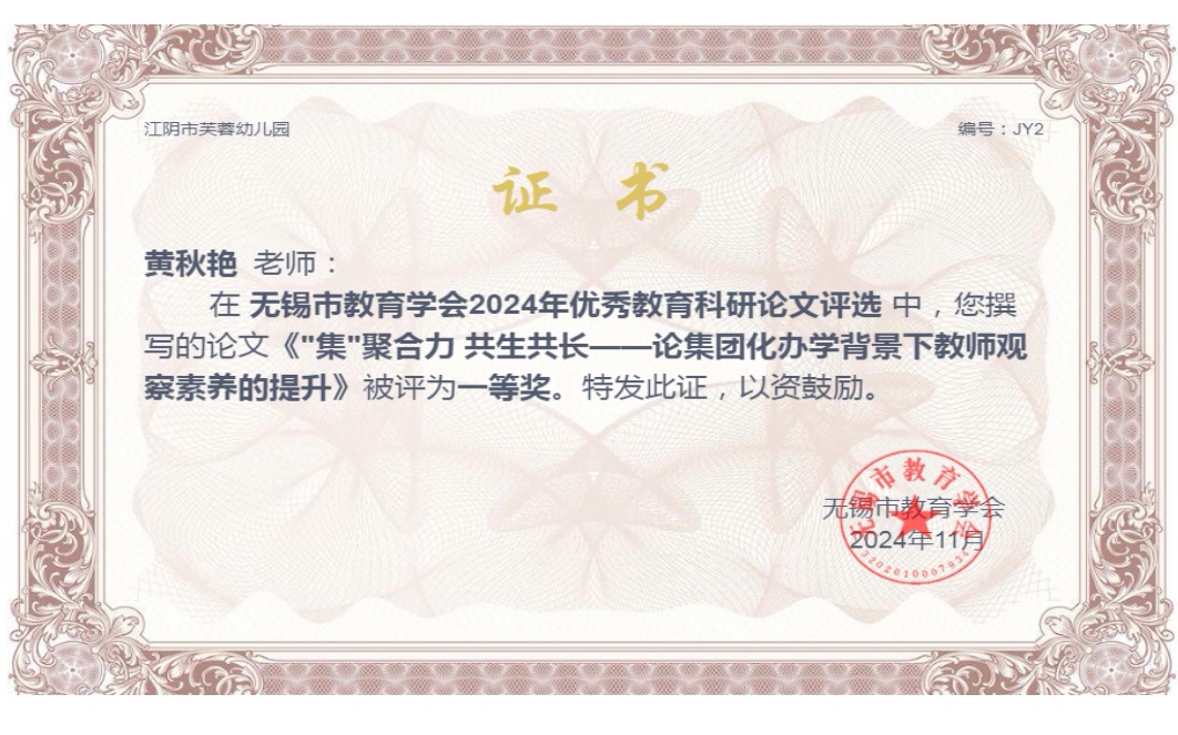 黄秋艳老师的论文《“集”聚合力 共生共长》在无锡市教育学会2024年优秀教育科研论文评选获一等奖