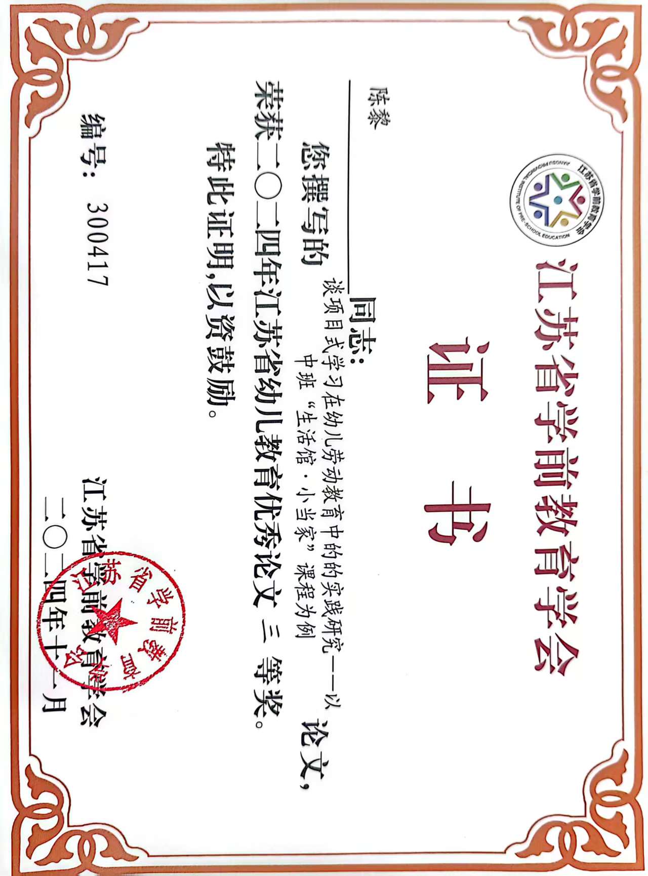 陈黎老师撰写的论文《谈项目式学习在幼儿劳动教育中的实践研究》在江苏省幼儿教育优秀论文获三等奖