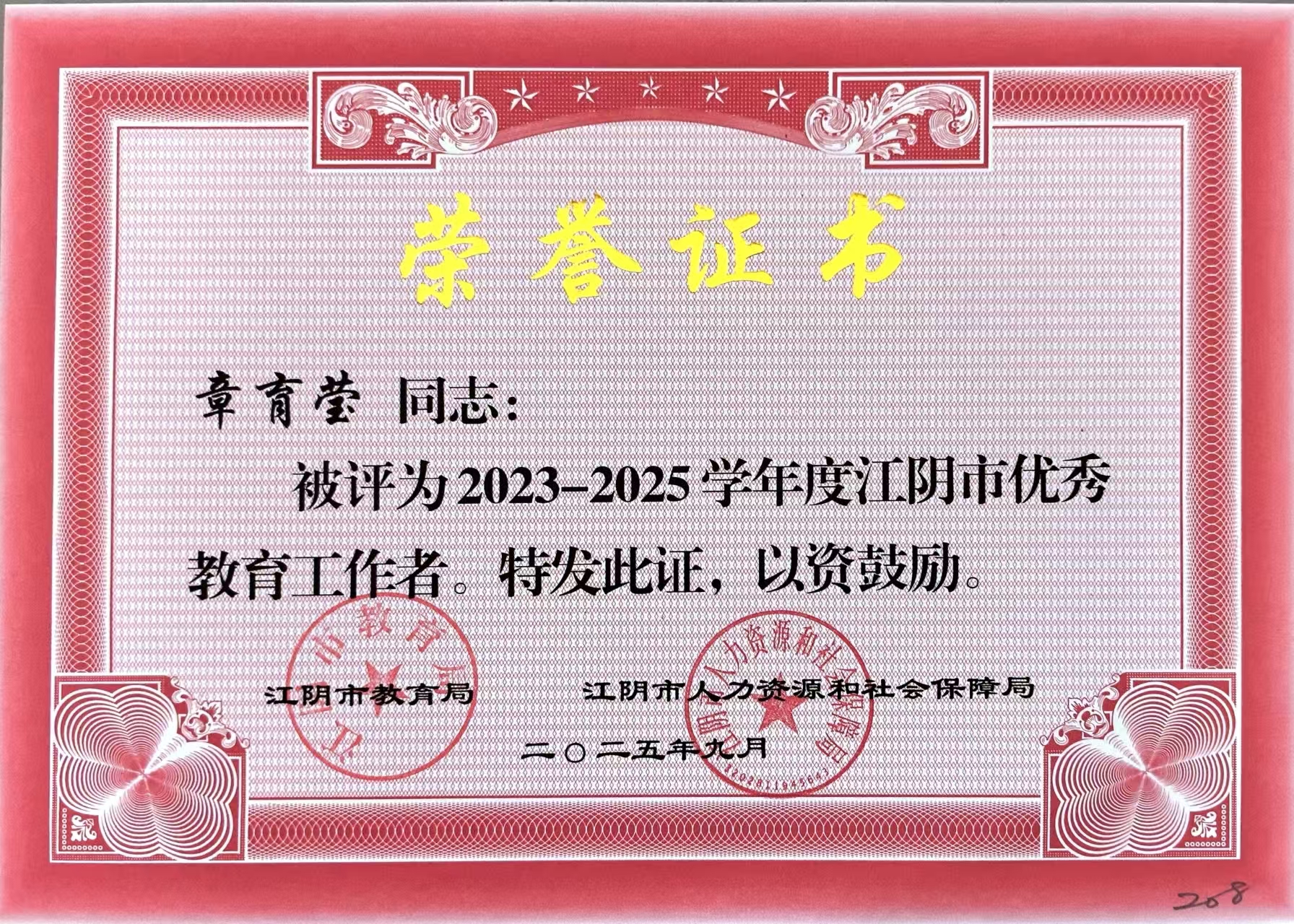 章育莹获评2023-2025学年江阴市优秀教育工作者