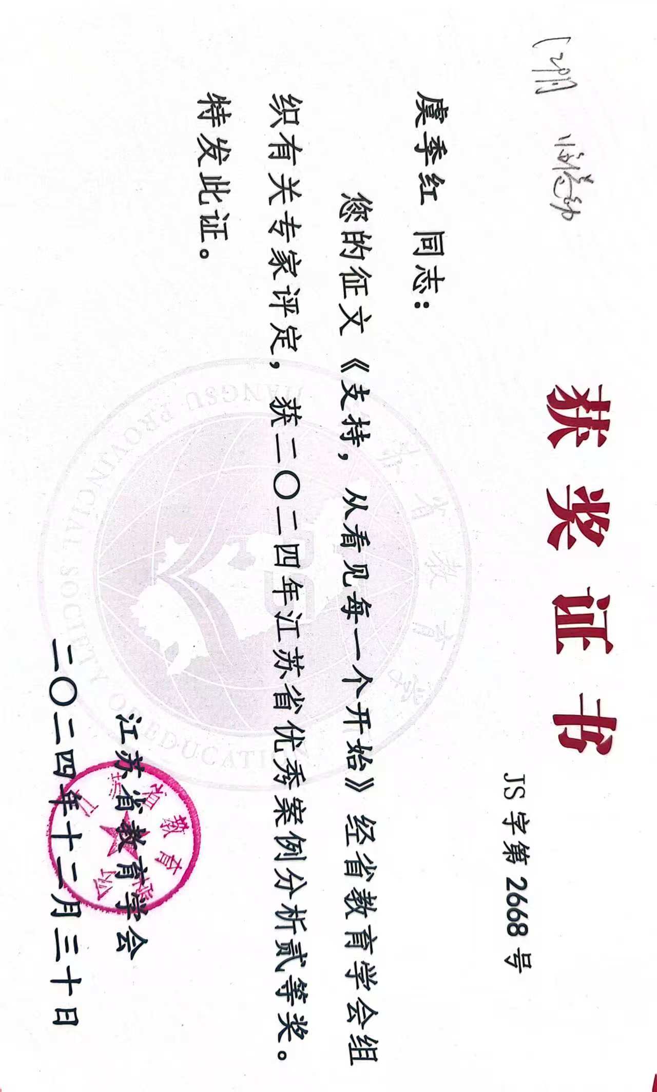 虞季红老师撰写的《支持,从看见每一个开始》获江苏省优秀案例分析二等奖