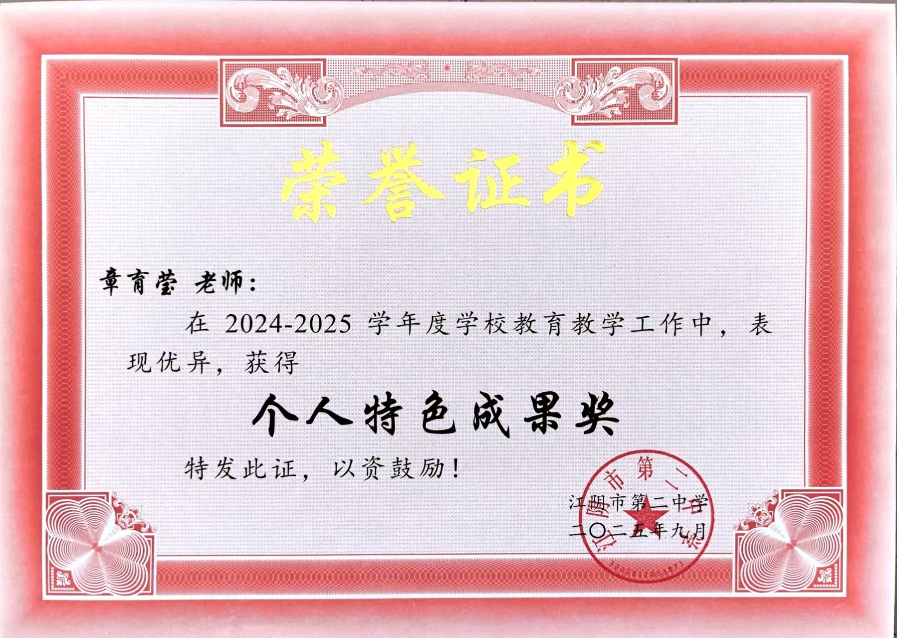 章育莹获评2024-2025学年学校教育工作个人特色成果奖