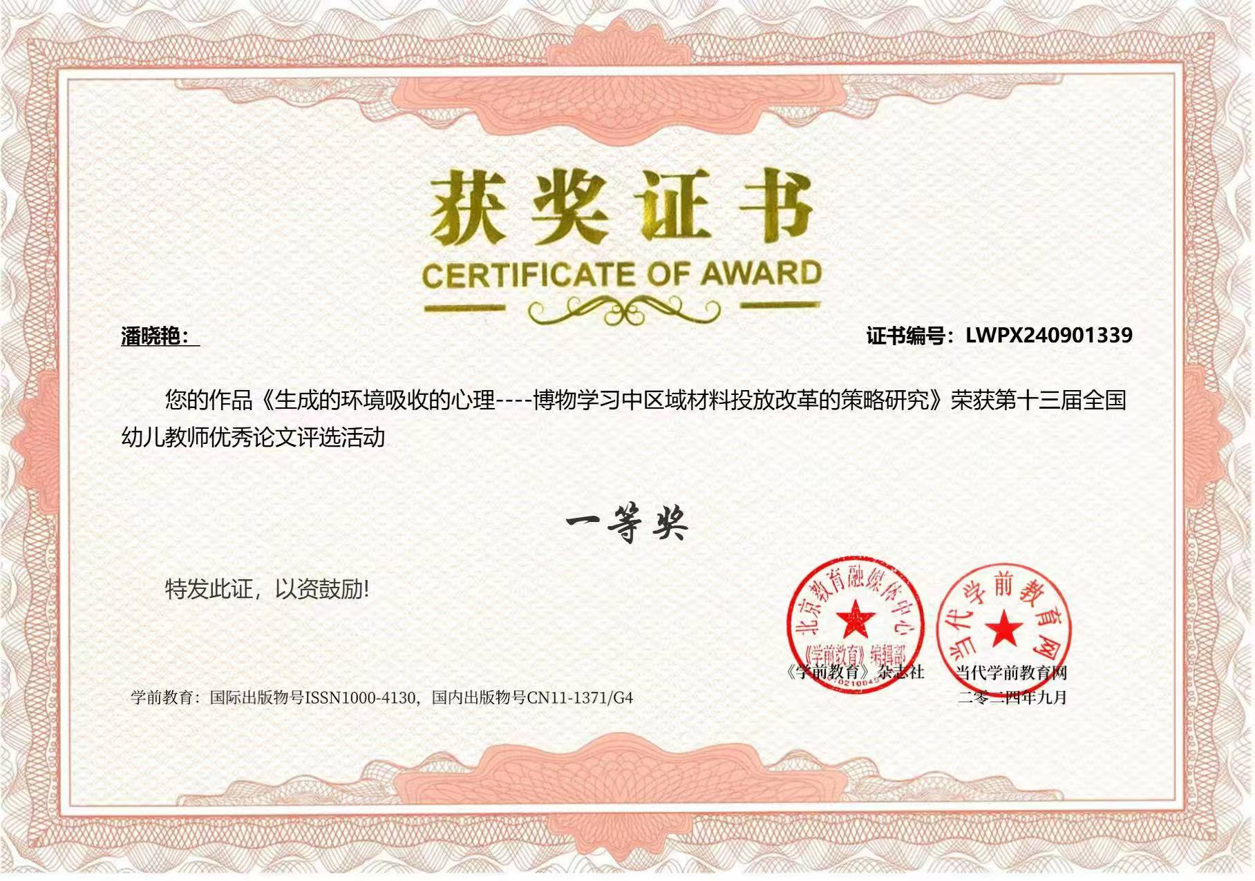 潘晓燕荣获第十三届全国幼儿教师优秀论文评选活动一等奖