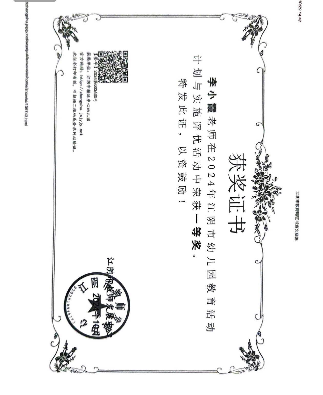 李小霞老师在2024年江阴市幼儿园教育活动计划与实施评优活动中获一等奖