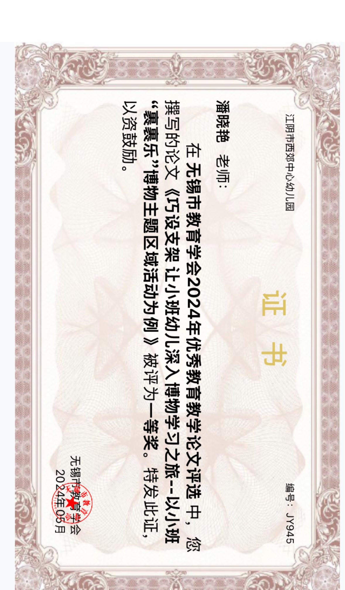 潘晓燕 无锡市教育学会2024年优秀教育教学论文评选中获一等奖