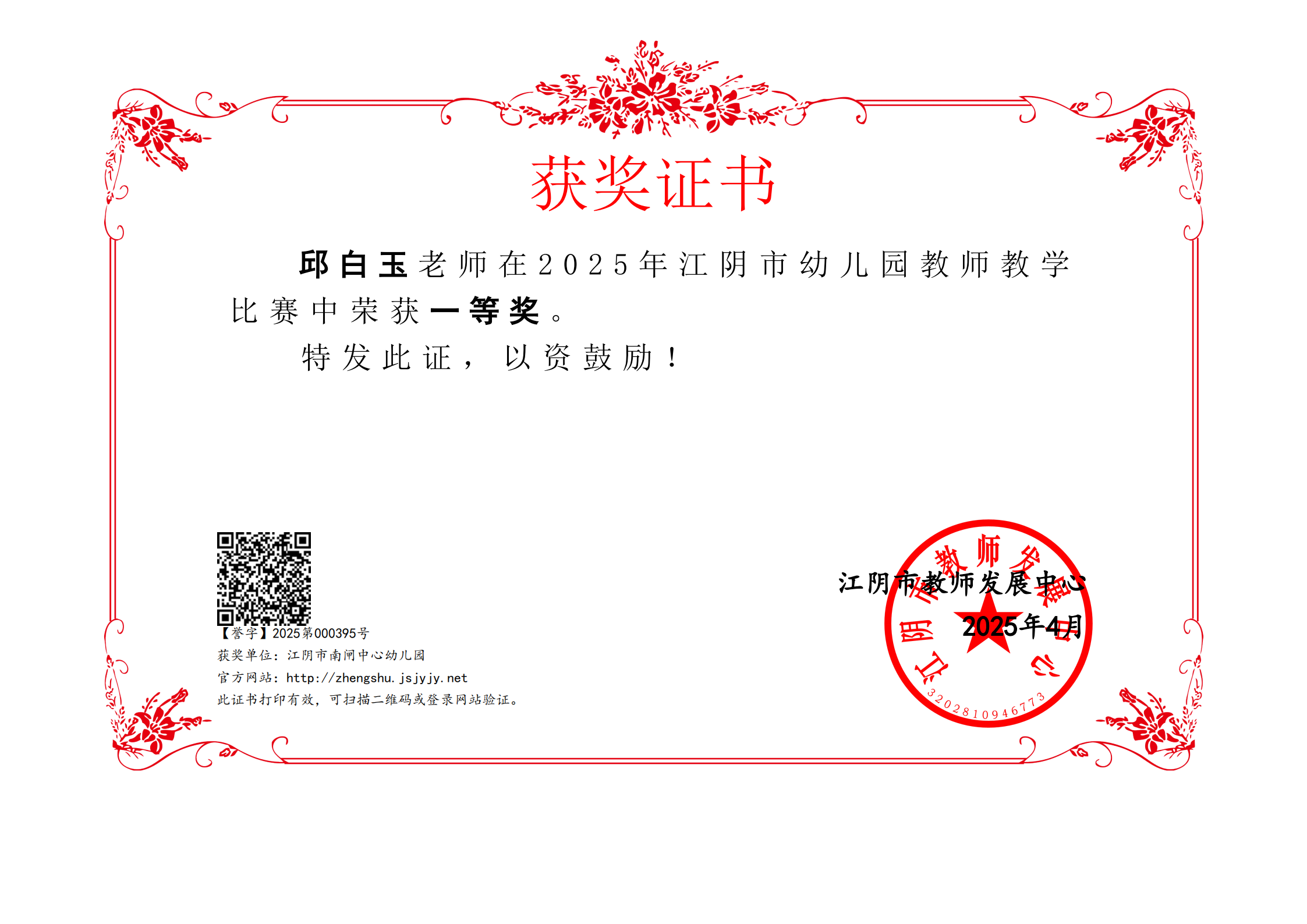 邱白玉老师在2025年江阴市幼儿园教师教学 比赛中荣获一等奖