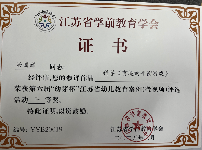 汤国娣老师获第六届“幼芽杯”江苏省幼儿教育案例(微视频)评选活动二等奖 2025-09-17