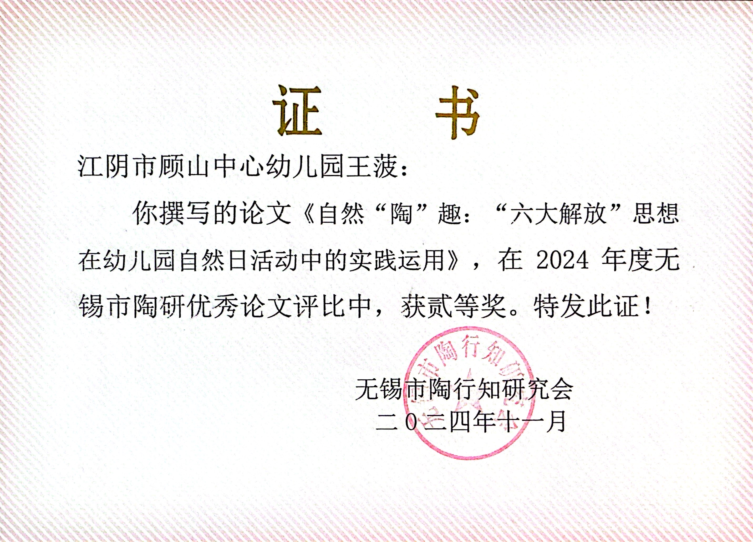 王菠老师在2024年度无锡市陶研优秀论文评比中获贰等奖