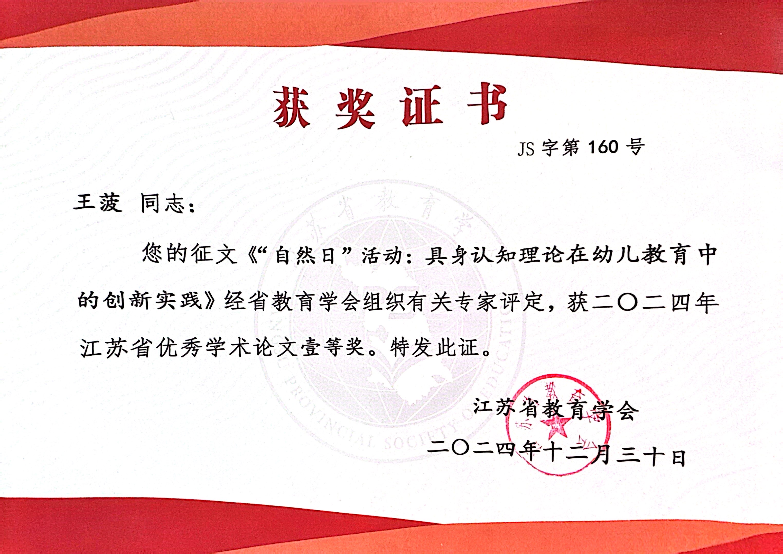 王菠老师在江苏省优秀学术论文中获壹等奖