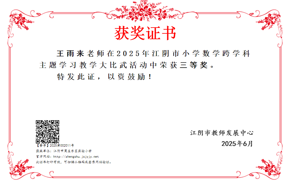 王雨来江阴市小学数学跨学科主题学习大比武三等奖 2025-09-17
